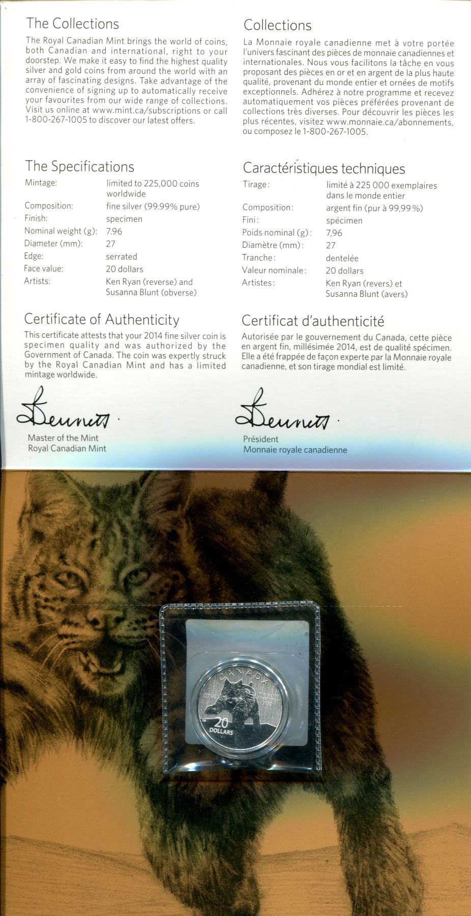 2014 Bobcat Silver $20. .9999 pure silver. Specimen. In folder of issue.