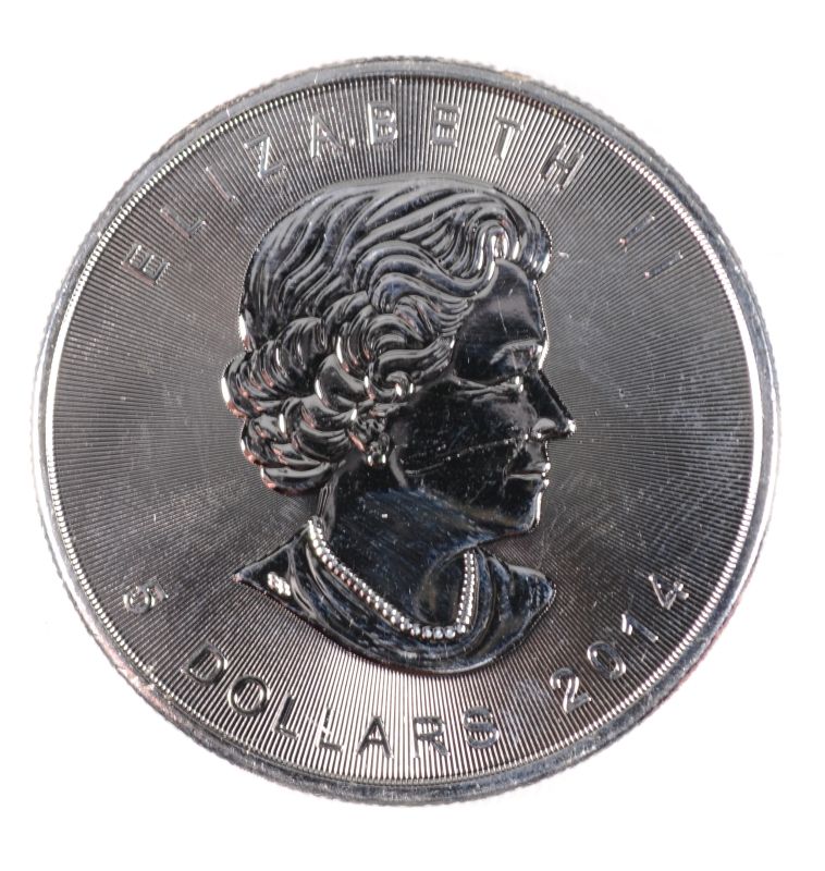 2014 CANADIAN MAPLE LEAF, $5.00 ONE OUNCE .9999 SILVER COIN