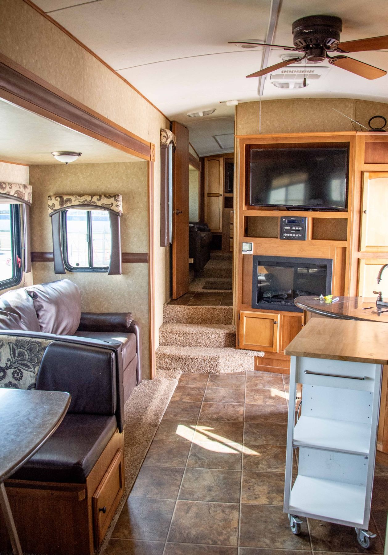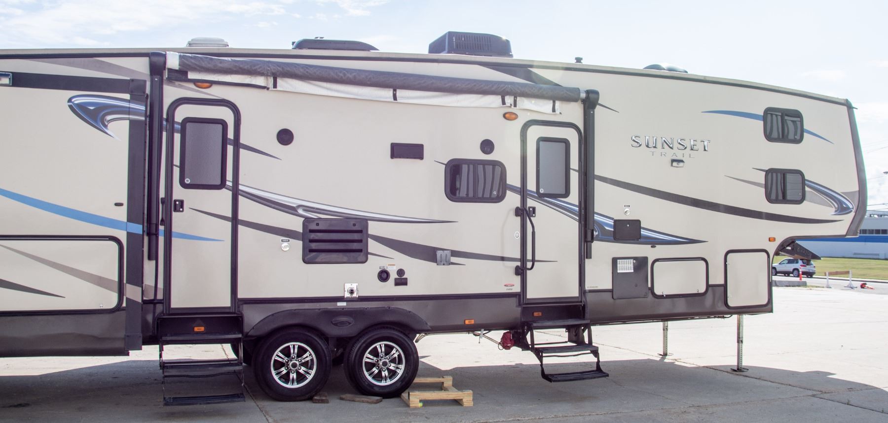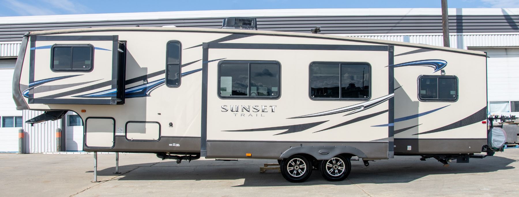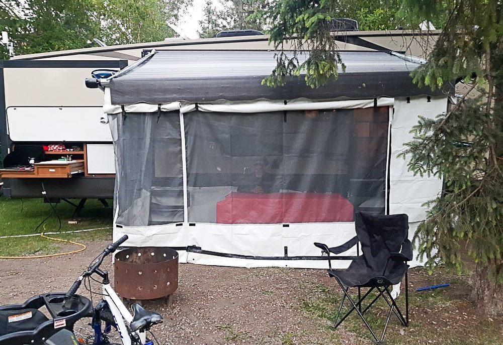 ONE POWER RETRACTABLE AWNING, NO SCREENED ROOM. MODEL UNIQUE FEATURES: PATIO SCREEN ROOM, WASHER / SPINNER, 2 BEDROOMS, 2 WASHROOMS, AUTOMATIC STABILIZER, AUTOMATIC CLOSE ROOF VENT, OUTSIDE BBQ HOOK-UP (BBQ INCLUDED), ELECTRIC FIREPLACE.