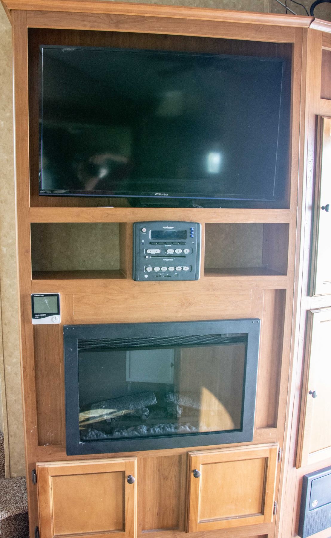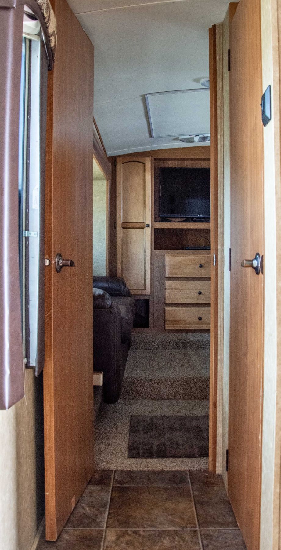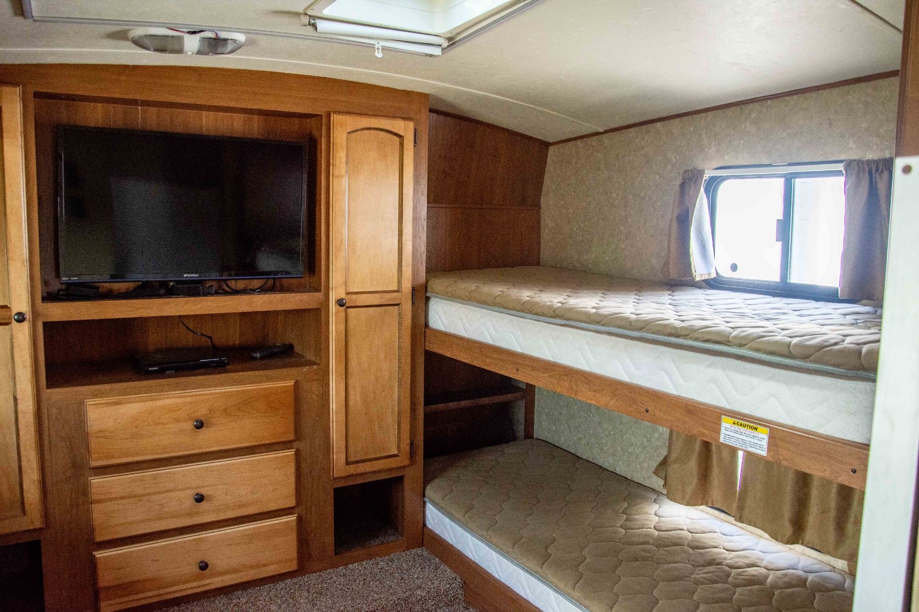 ONE POWER RETRACTABLE AWNING, NO SCREENED ROOM. MODEL UNIQUE FEATURES: PATIO SCREEN ROOM, WASHER / SPINNER, 2 BEDROOMS, 2 WASHROOMS, AUTOMATIC STABILIZER, AUTOMATIC CLOSE ROOF VENT, OUTSIDE BBQ HOOK-UP (BBQ INCLUDED), ELECTRIC FIREPLACE.