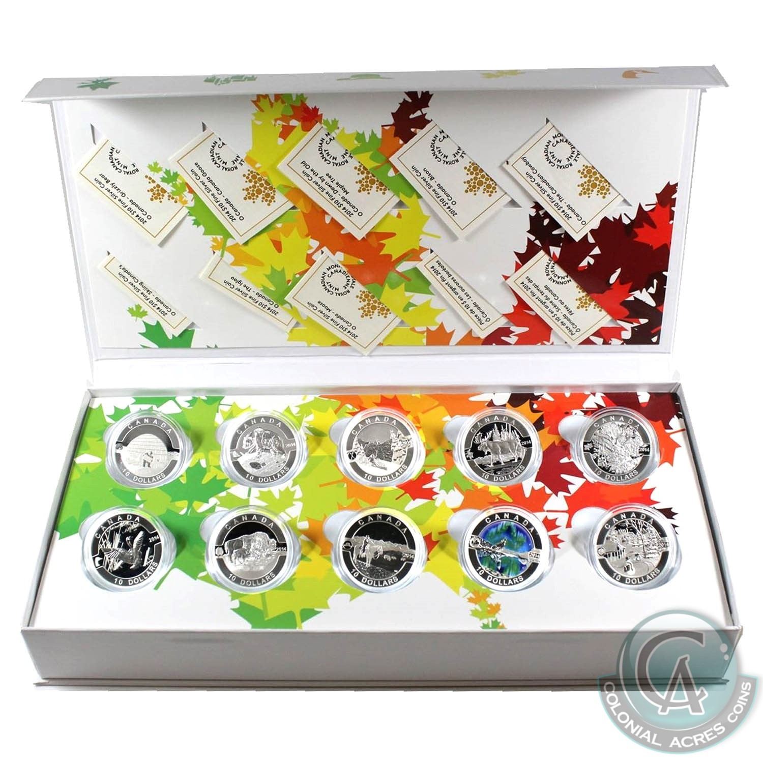 2014 Canada $10 Complete 10-coin O Canada Series Fine Silver Set with Collector Case (Tax Exempt). You will receive The Igloo, The Grizzly, Skiing Canada's Slopes, The Moose, Down by the Old Maple, Canada Goose, The Canadian Cowboy, Bison, The Northern Lights, and Canadian Holiday Scene. 10pcs