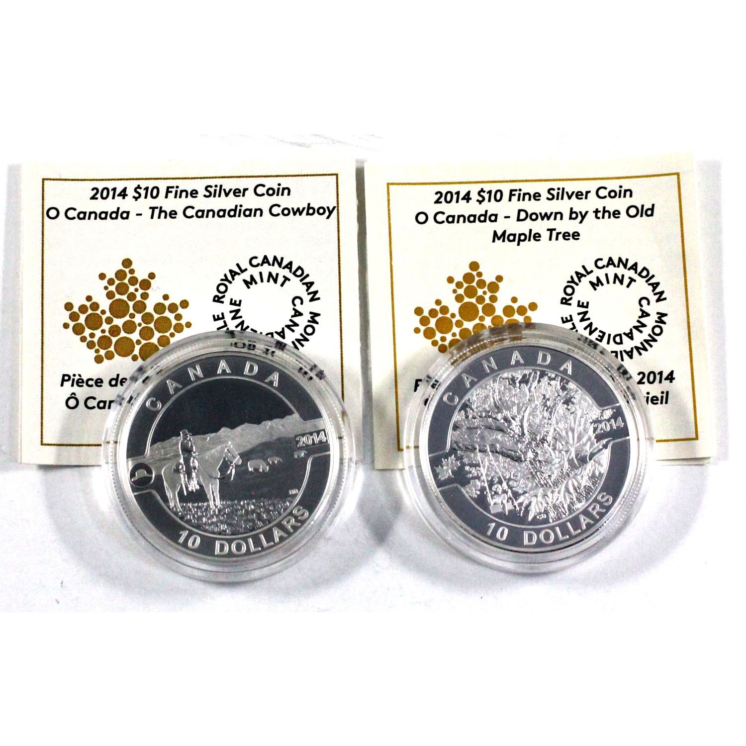 2014 Canada $10 O Canada Series Canadian Cowboy & Down by the old maple tree Fine Silver Coins Encapsulated with COAs. ( Tax Exempt) 2pcs