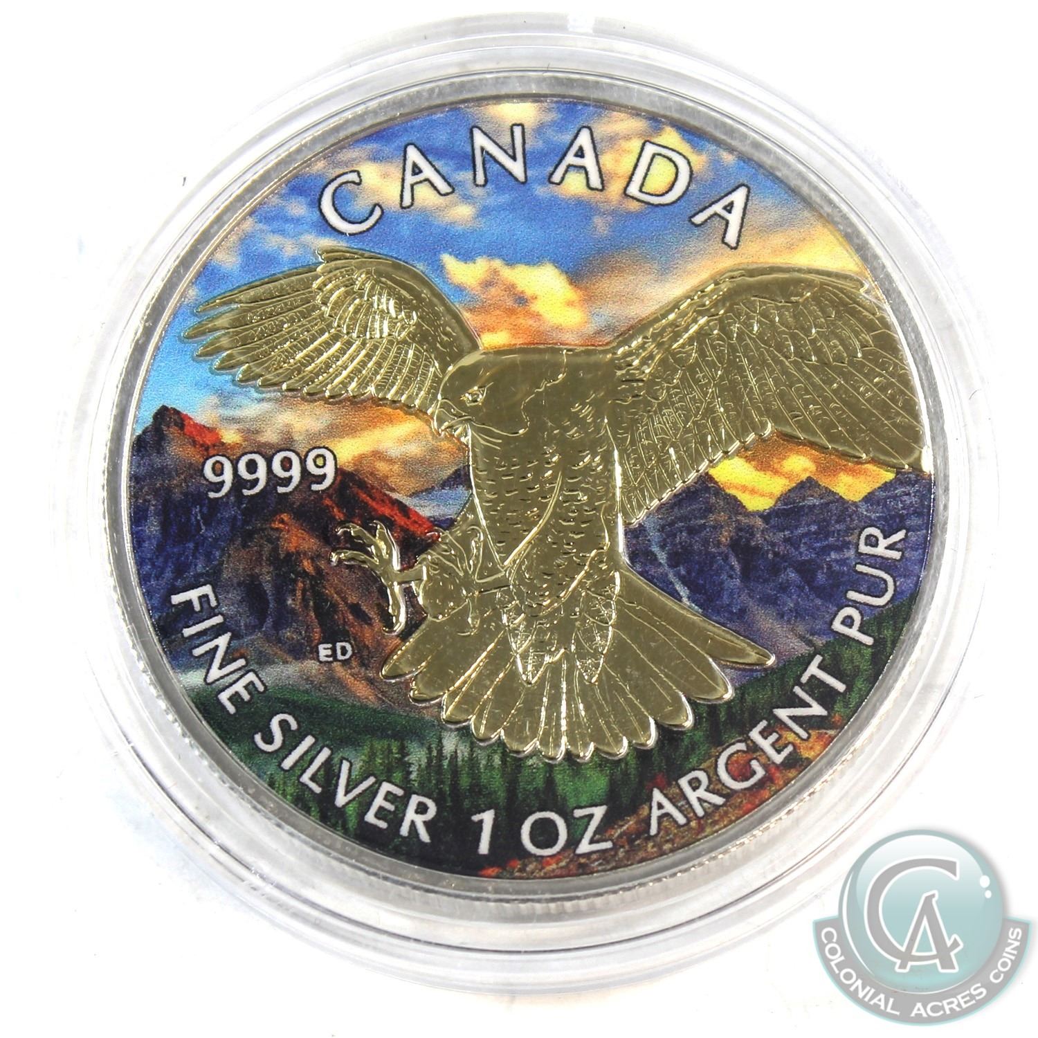 2014 Canada 1oz Coloured & Gold Plated Peregrine Falcon Fine Silver Coin in Capsule (Scuffed capsule). (TAX Exempt)