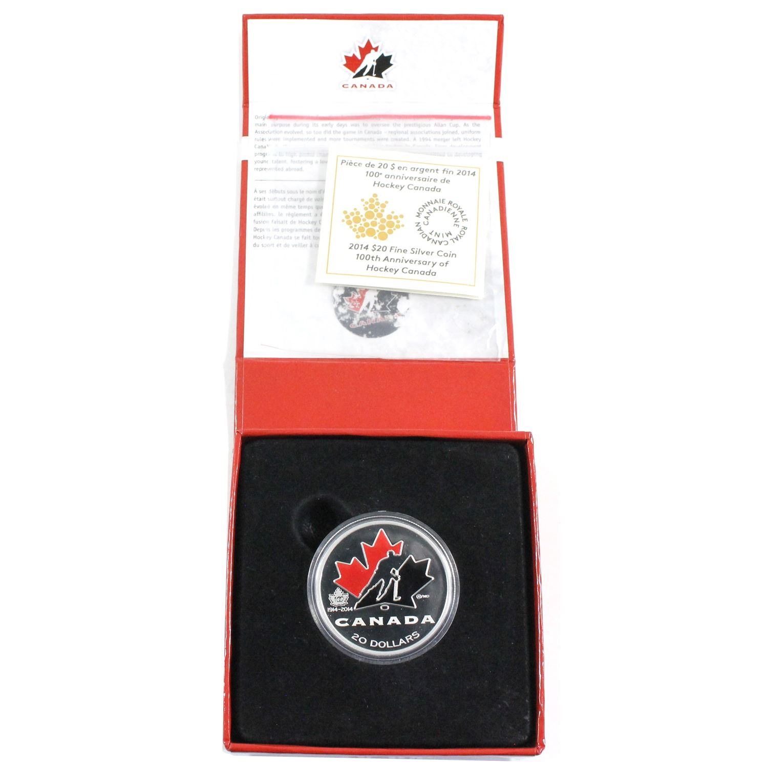 2014 Canada $20 100th Anniversary of Hockey Canada Fine Silver Coloured Coin (Capsule lightly scratched). TAX Exempt