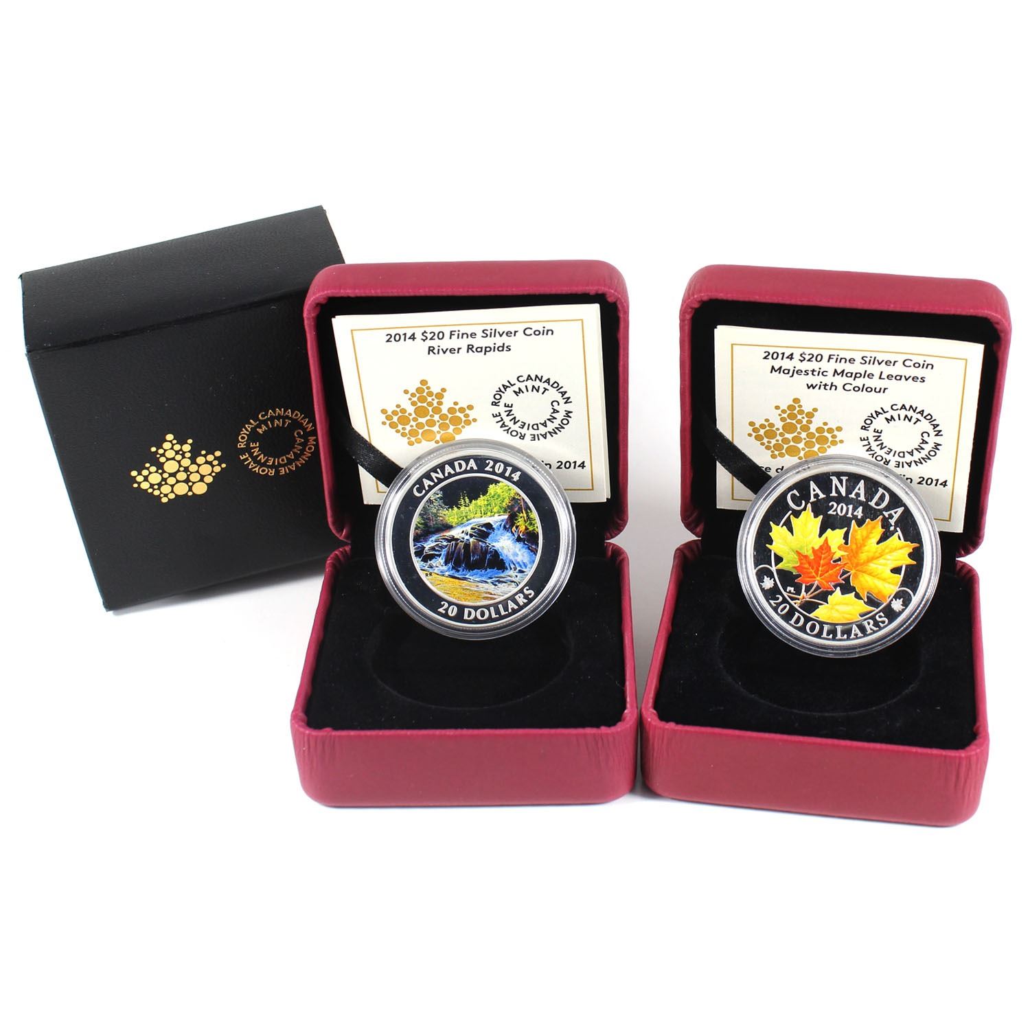 2014 Canada $20 Coloured Majestic Maple Leaves & River Rapids Fine Silver Coins (TAX Exempt). Note, Maple Leaves contains a minting impairement on the reverse & no outer box. River Rapids outer box is bent. 2pcs.