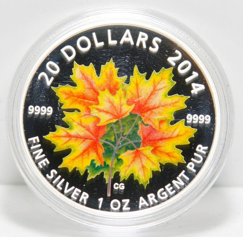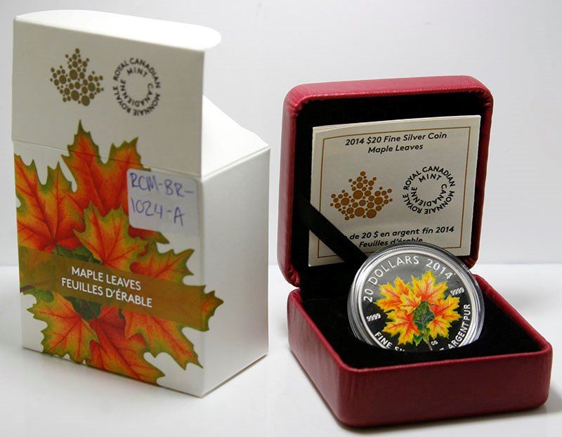 2014 Canadian $20 Fine Silver Coin - Maple Leaves - Coloured
