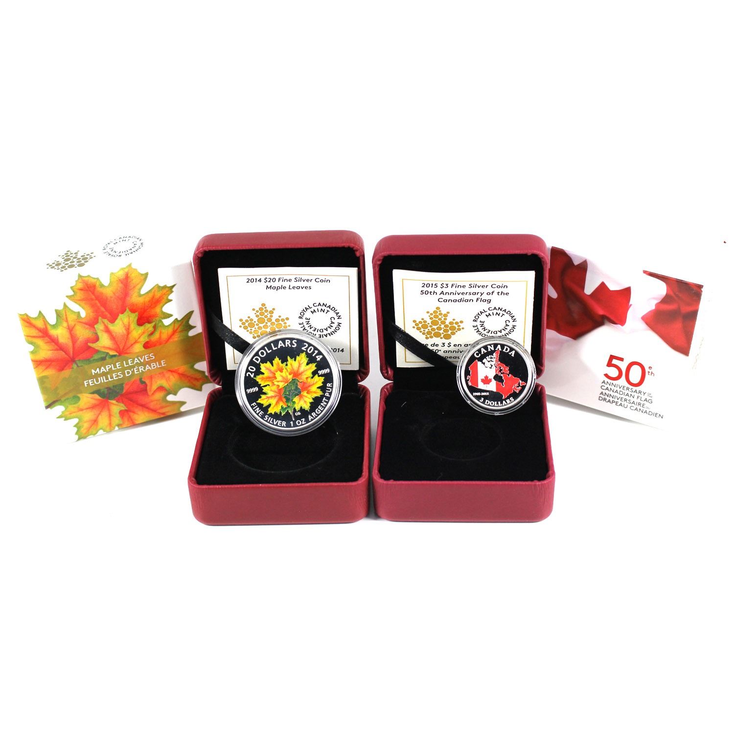2014 Canada $20 Glow-in-the-Dark Maple Leaves & 2015 $3 50th Anniversary of the Canadian Flag Fine Silver Coins. 2pcs (TAX Exempt)