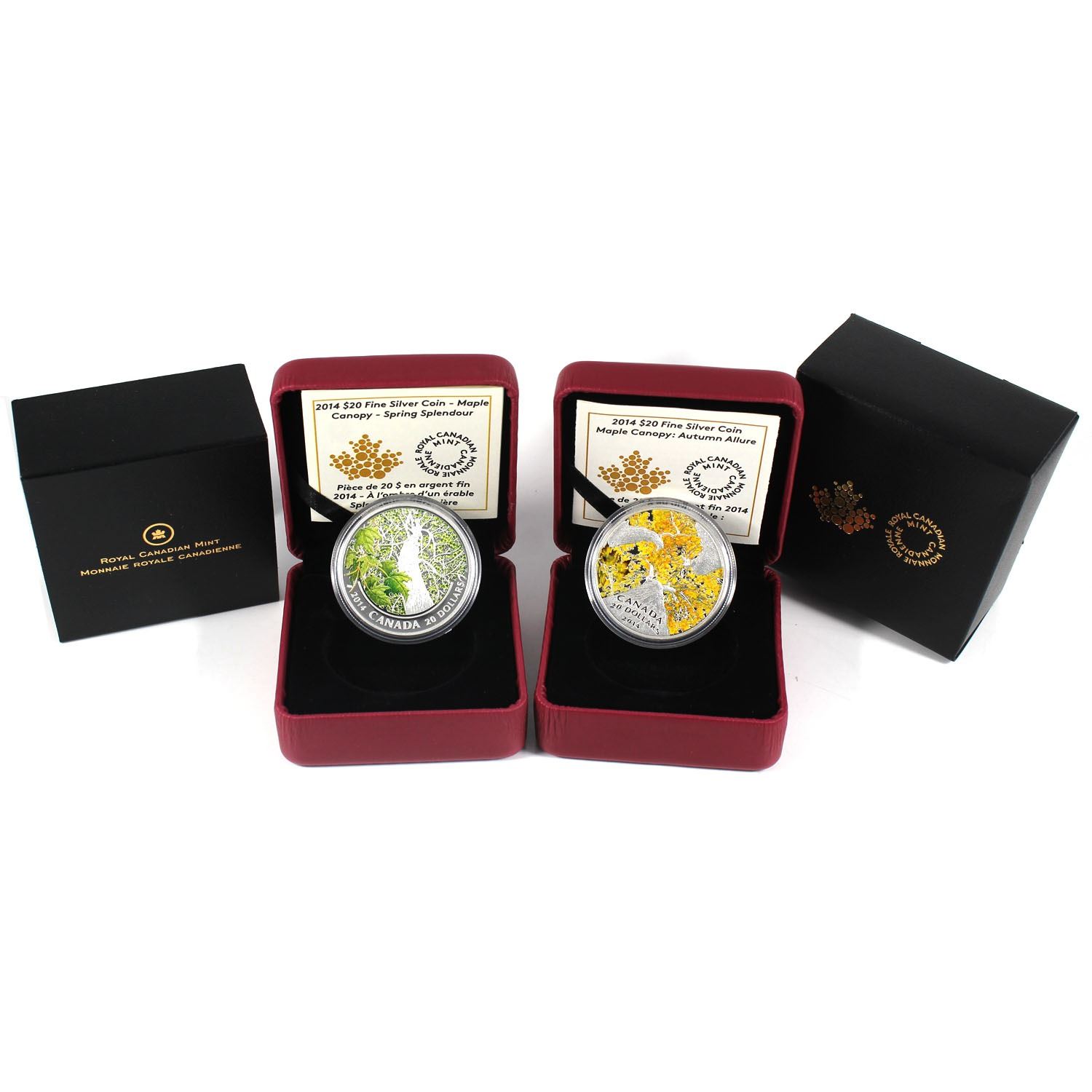 2014 Canada $20 Maple Canopy Spring Splendor & Autumn Allure Fine Silver Coins (TAX Exempt). 2pcs.