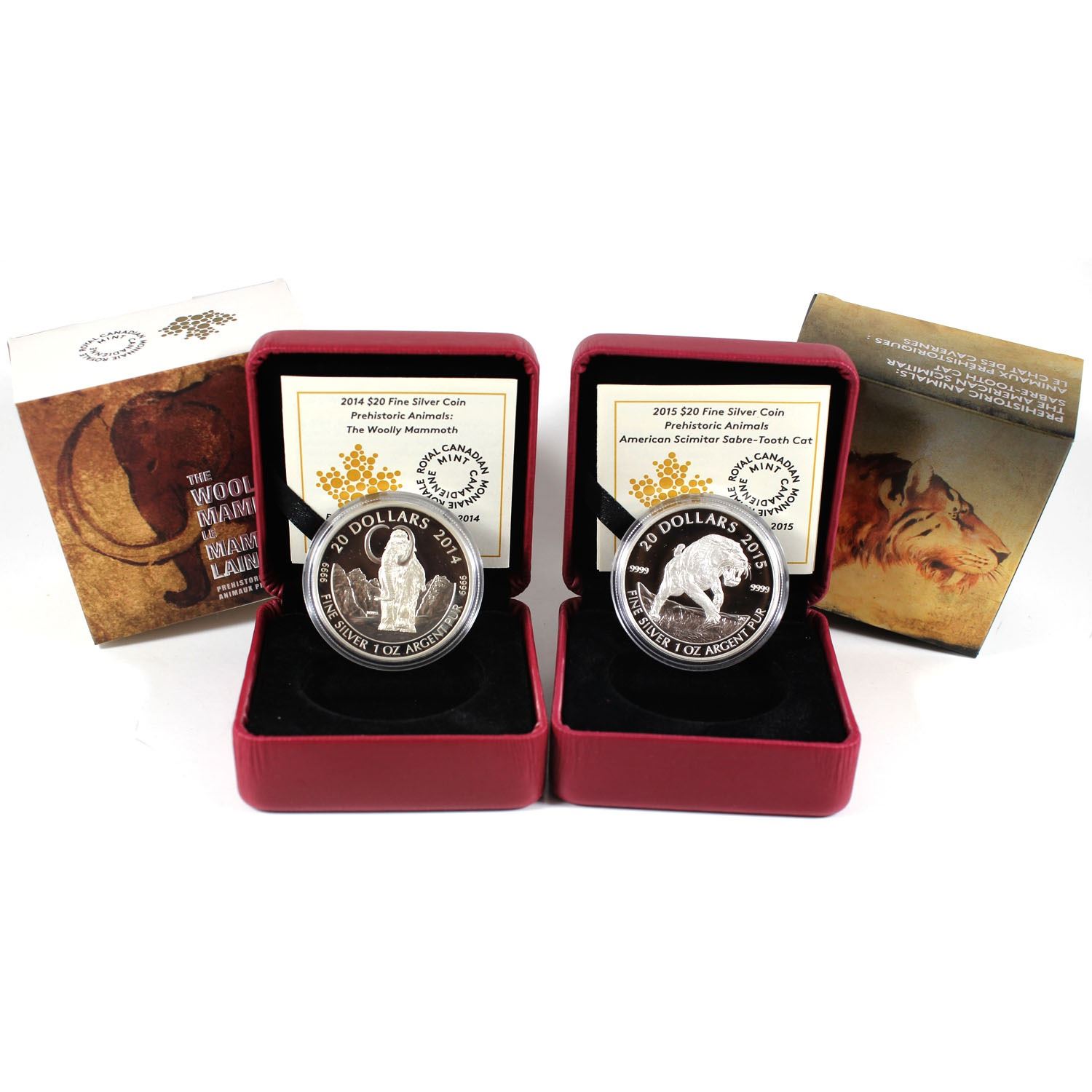 2014 Canada $20 Prehistoric Animals - The Woolly Mammoth & 2015 American Scimitar Sabre-Tooth Cat Fine Silver Coins. 2pcs (TAX Exempt)