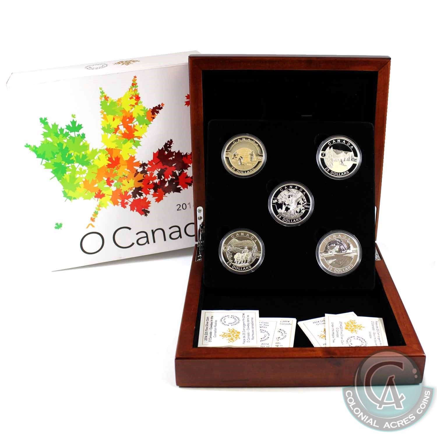 2014 Canada $25 Complete O Canada 5-Coin Fine Silver Set with Deluxe Display Case (Tax Exempt). Coins are lightly toned.