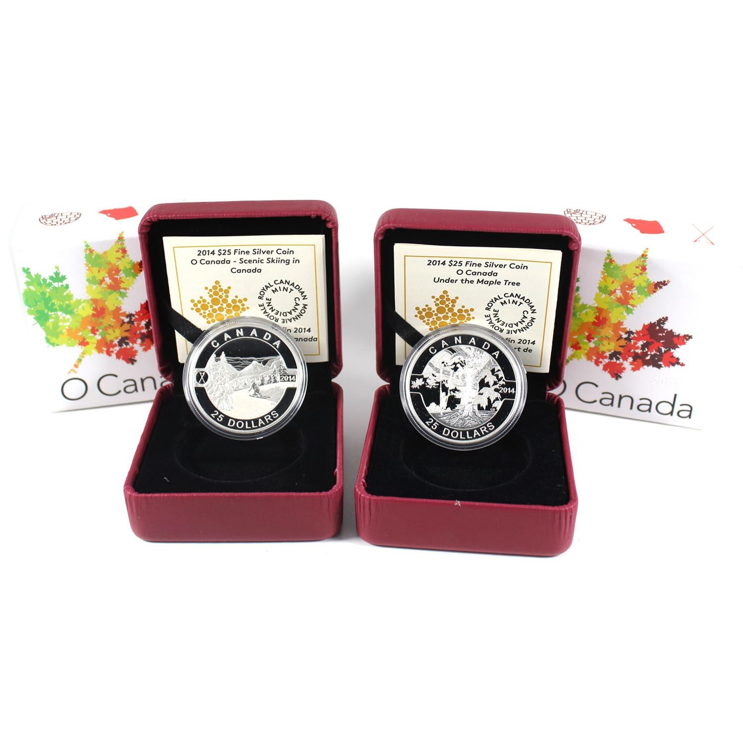 2014 Canada $25 O Canada Fine Silver Coins - Under the Maple Tree & Scenic Skiing in Canada. 2pcs (TAX Exempt)