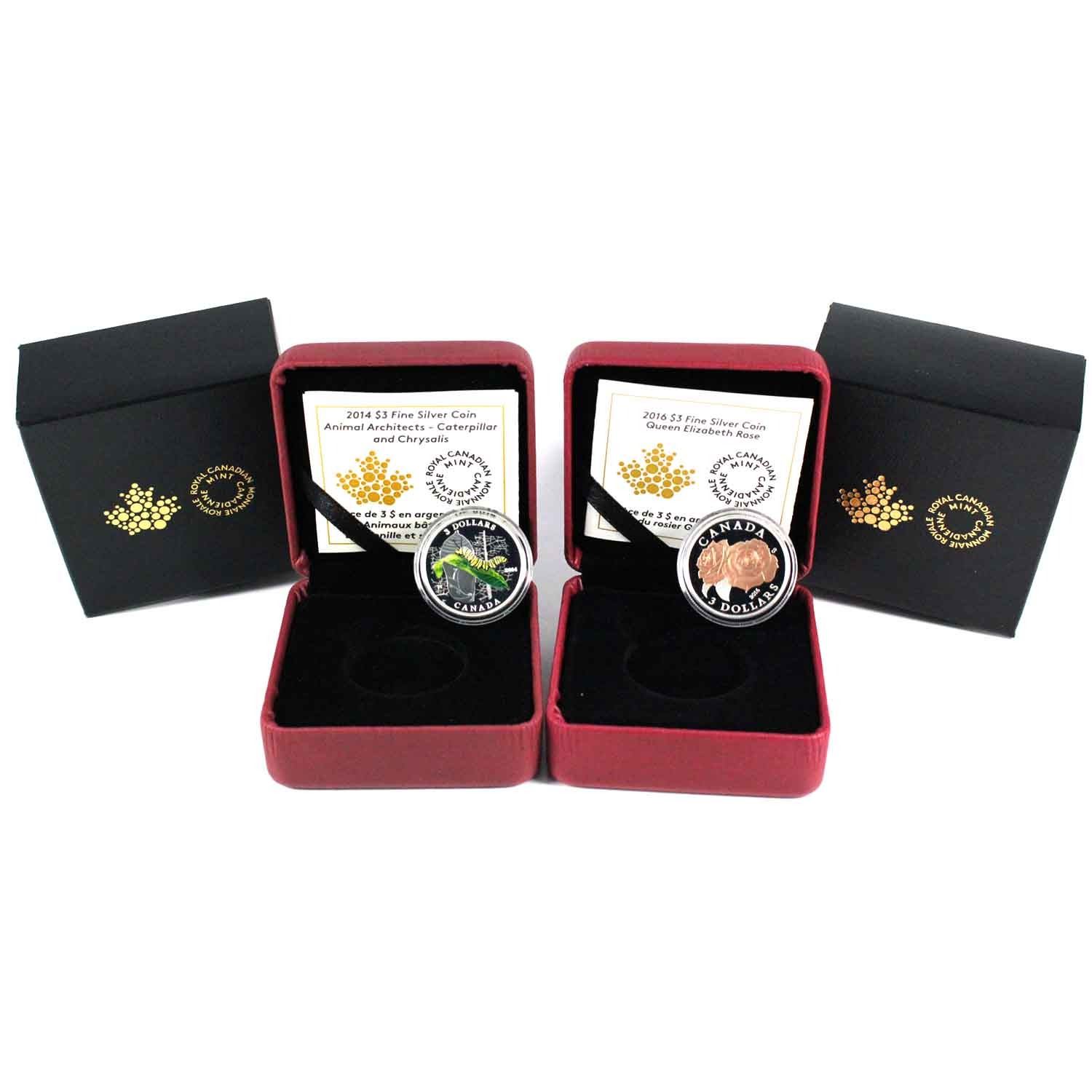 2014 Canada $3 Animal Architects - Caterpillar and Chrysalis & 2016 $3 Queen Elizabeth Rose Fine Silver Coins (2014 capsule lightly scratched). 2pcs (TAX Exempt)