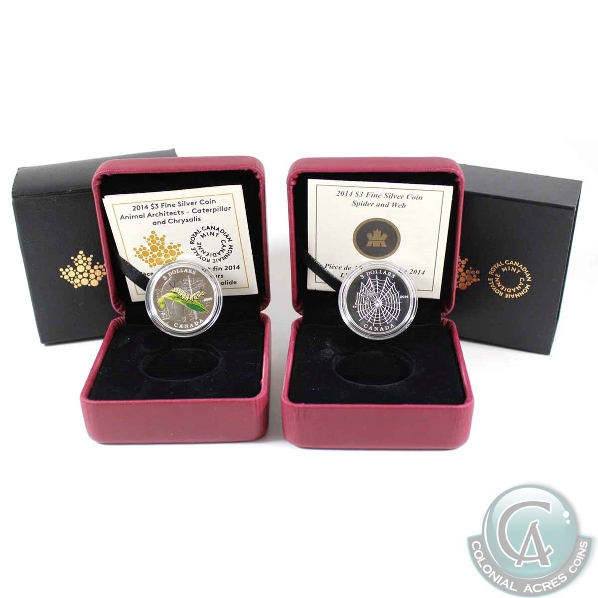 2014 Canada $3 Spider & Web and Caterpillar & Chrysalis Fine Silver Coins (TAX Exempt). Please note the outer box of the Caterpillar has wear. 2pcs