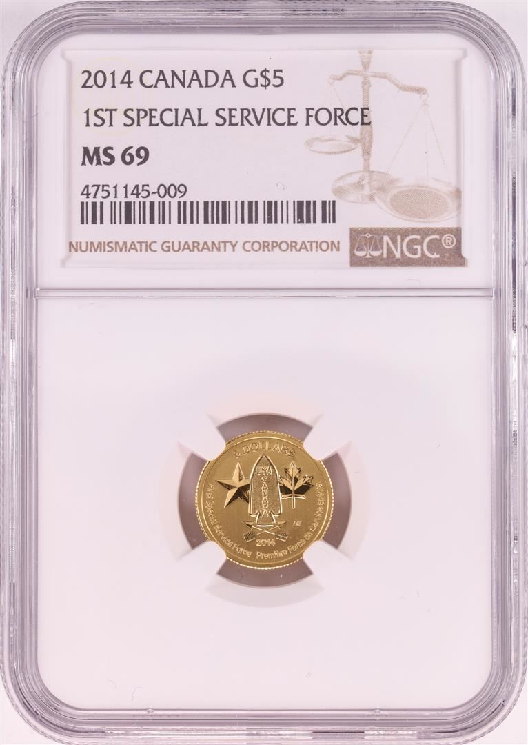 One 2014 Canada $5 1st Special Service Force Commemorative Gold Coin NGC MS69. NGC Certified.