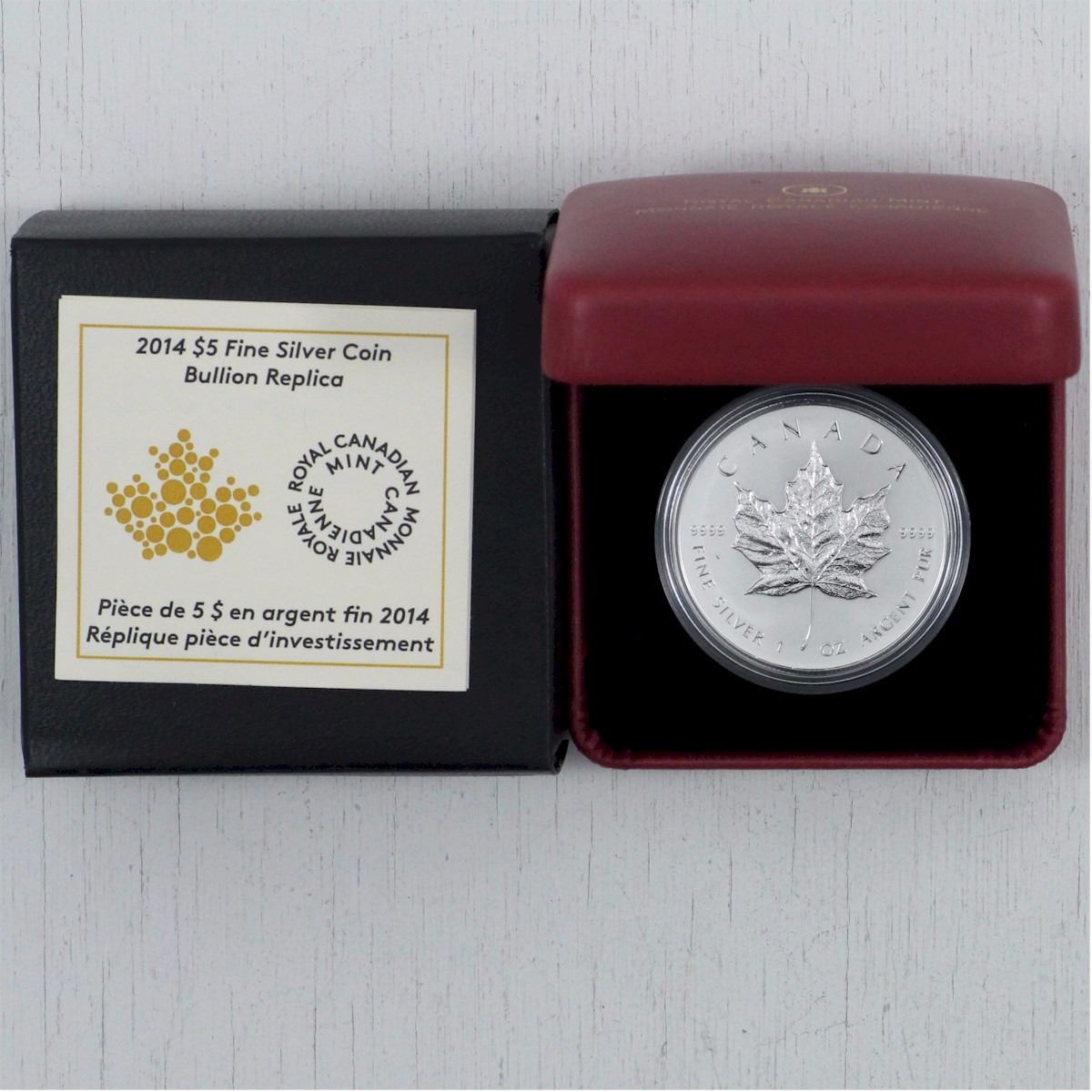 2014 Canada $5 Fine Silver Maple Leaf Reverse Proof Bullion Replica (TAX Exempt). Buyers Premium will be added on all items as per our terms of sale. We accept Paypal, Credit Card, E-Transfer Payments, Cheque or Money Orders (there is an additional 3% fee for using Paypal or Credit Card). All invoices will be emailed immediately following the auction, please contact us if you would like to pay by credit card or receive a new revised lower total for mailing in payment or sending an e-transfer (3% discount). All Items Are Sold "AS IS", no returns