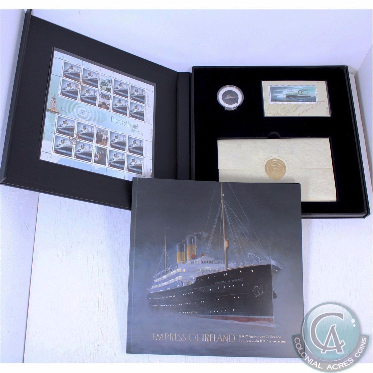 2014 Canada Empress of Ireland 50ct Coin and Stamp Collector's Set. Set includes a limited edition coin, two reproduction postcards, a pane of 16 domestic rate stamps, a souvenir sheet of the international stamp rate, two official first day covers, and richly detailed 36-page colour book detailing the story of the Empress of Ireland.