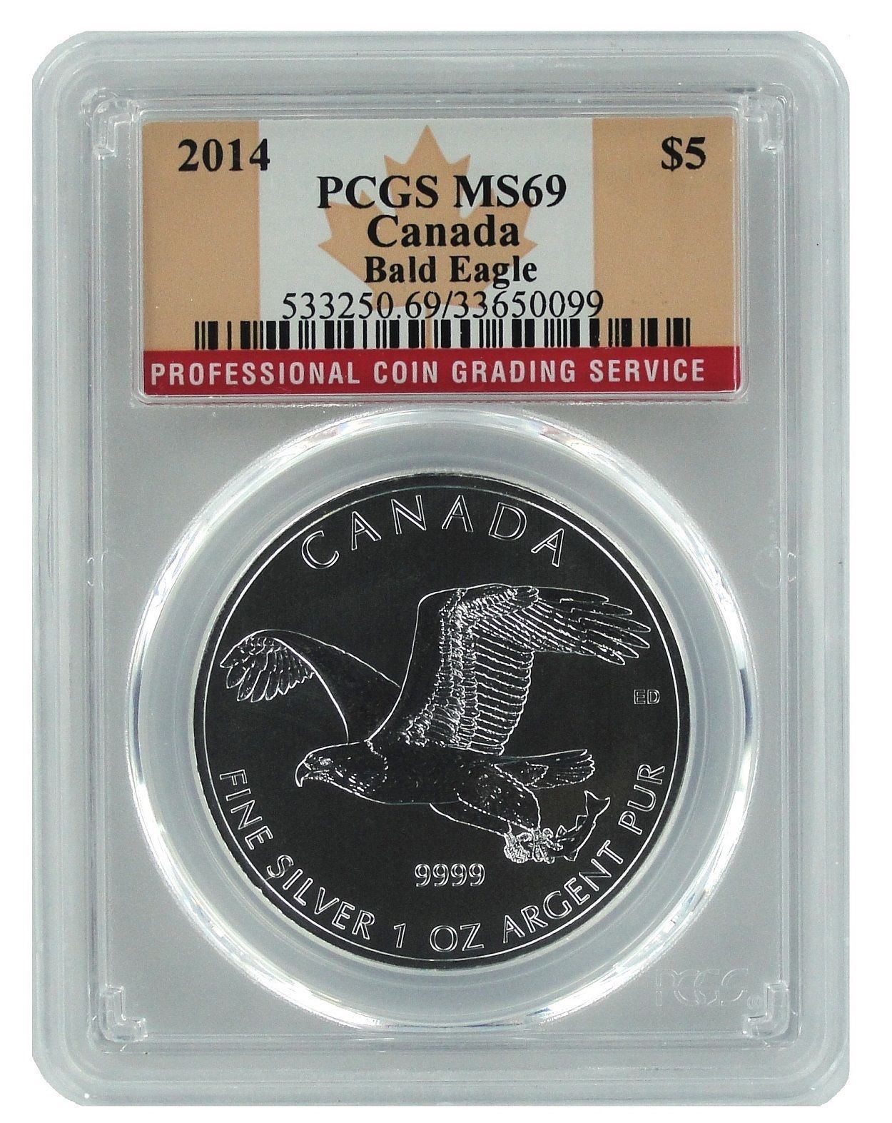 2014 Canada Silver Bald Eagle, PCGS MS69 Flag Label, ONE OUNCE .999 FINE SILVER
