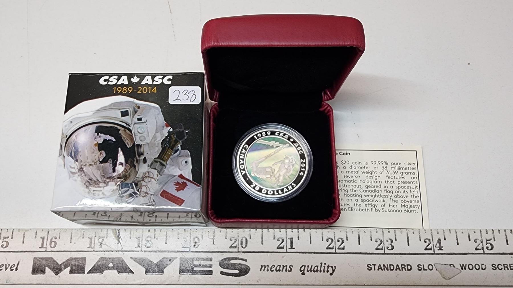 2014 Canadian Space Agency $20. Hologram of Canadian astronaut & CANADARM. 99.99% pure Silver. Proof with Ultra Heavy Cameo. Housed in its original case & box of issue.
