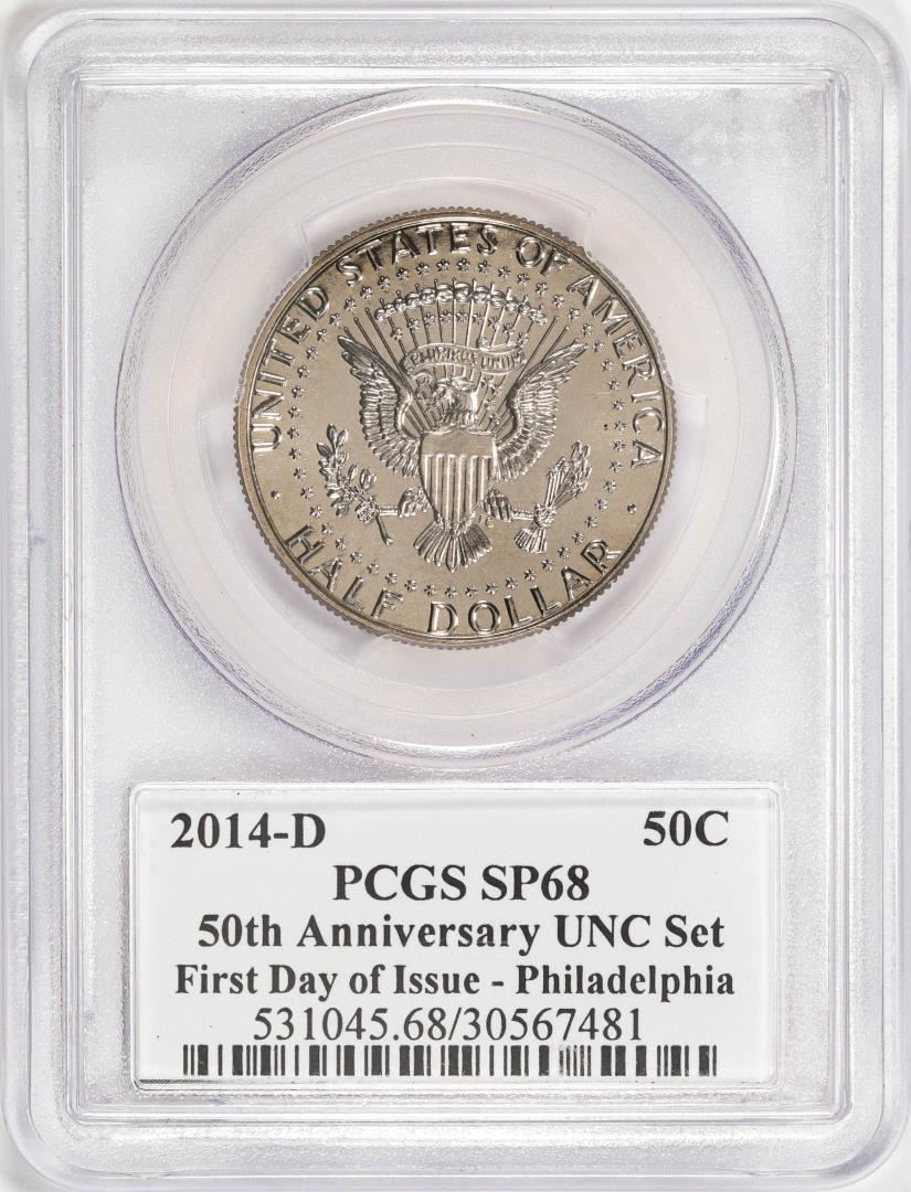 One 2014-D Kennedy Half Dollar Coin PCGS SP68 FDOI Philadelphia 50th Anniversary Unc Set. PCGS Graded.