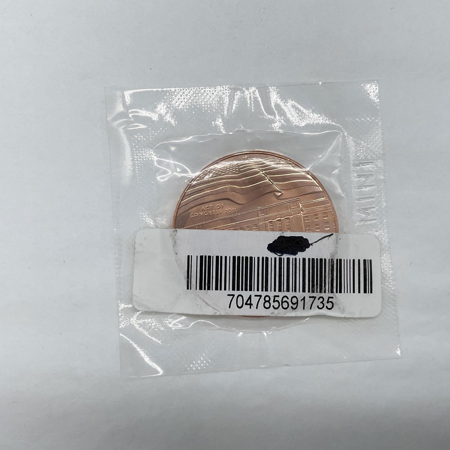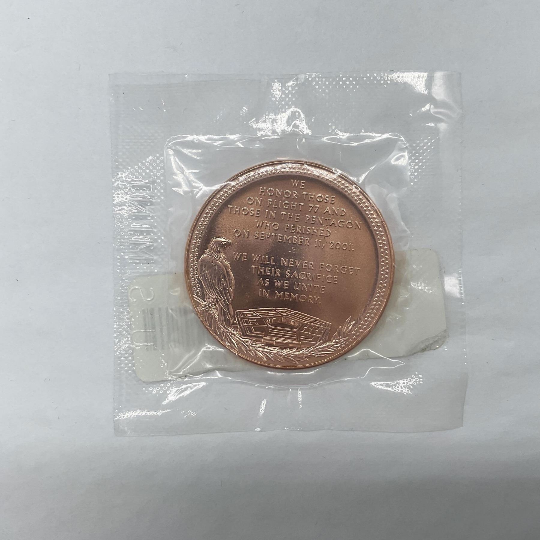 The obverse side depicts the rebuilt facade of the Pentagon, where Flight 77 crashed. The reverse side features 184 stars on a raised border around the edge of the design, one star for each of the victims of the tragedy at the Pentagon. The inscription reads: WE HONOR THOSE ON FLIGHT 77 AND THOSE IN THE PENTAGON WHO PERISHED ON SEPTEMBER 11, 2001. WE WILL NEVER FORGET THEIR SACRIFICE AS WE UNITE IN MEMORY. The medal is in original packaging: 2.5"L x 2.5"W.