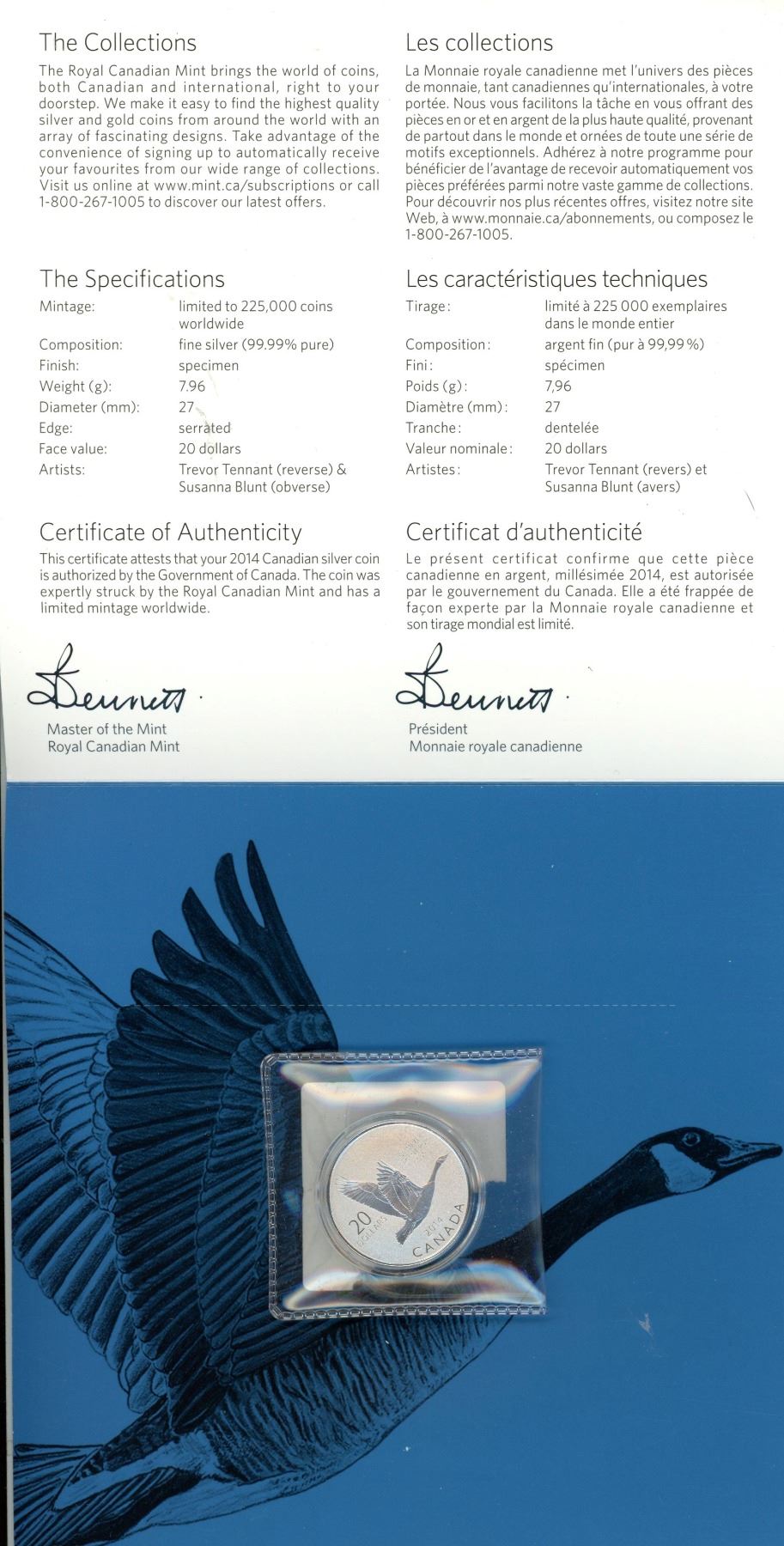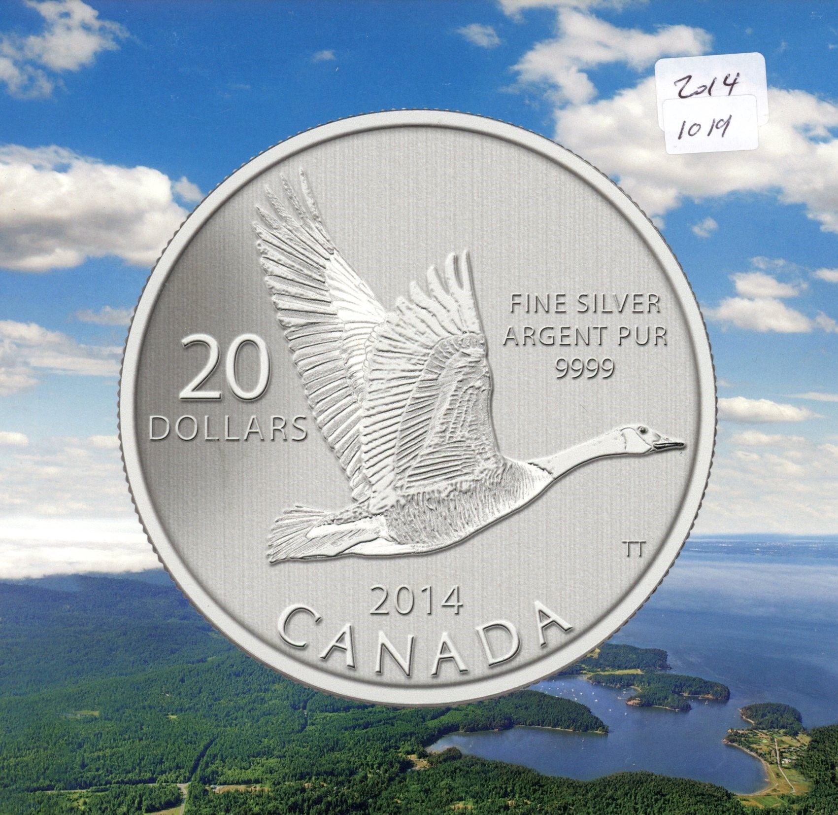 2014 Flying Canada Goose $20. .9999 pure silver. Housed in folder of issue.