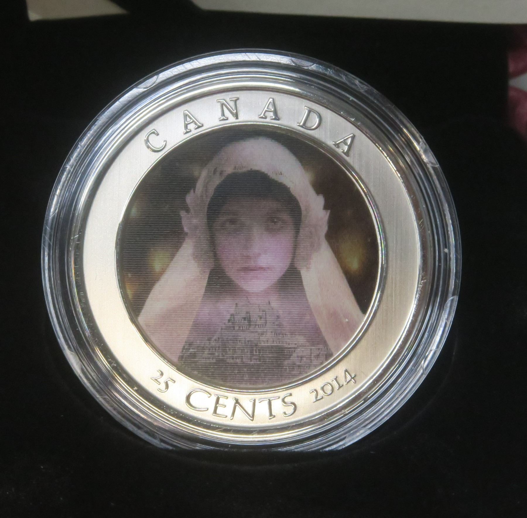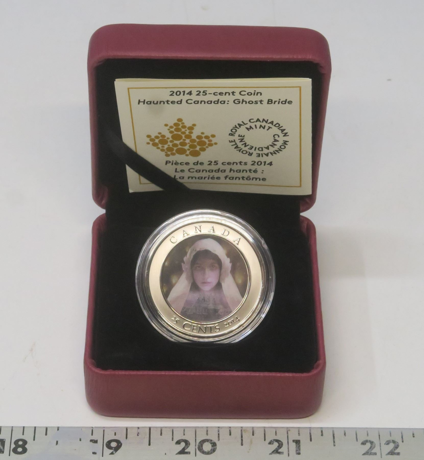 2014 Haunted Canada: Ghost Bride 25 Cents. Lenticular Image has the ghost’s eyes open & shut. Specimen. Housed in its original case & box of issue.