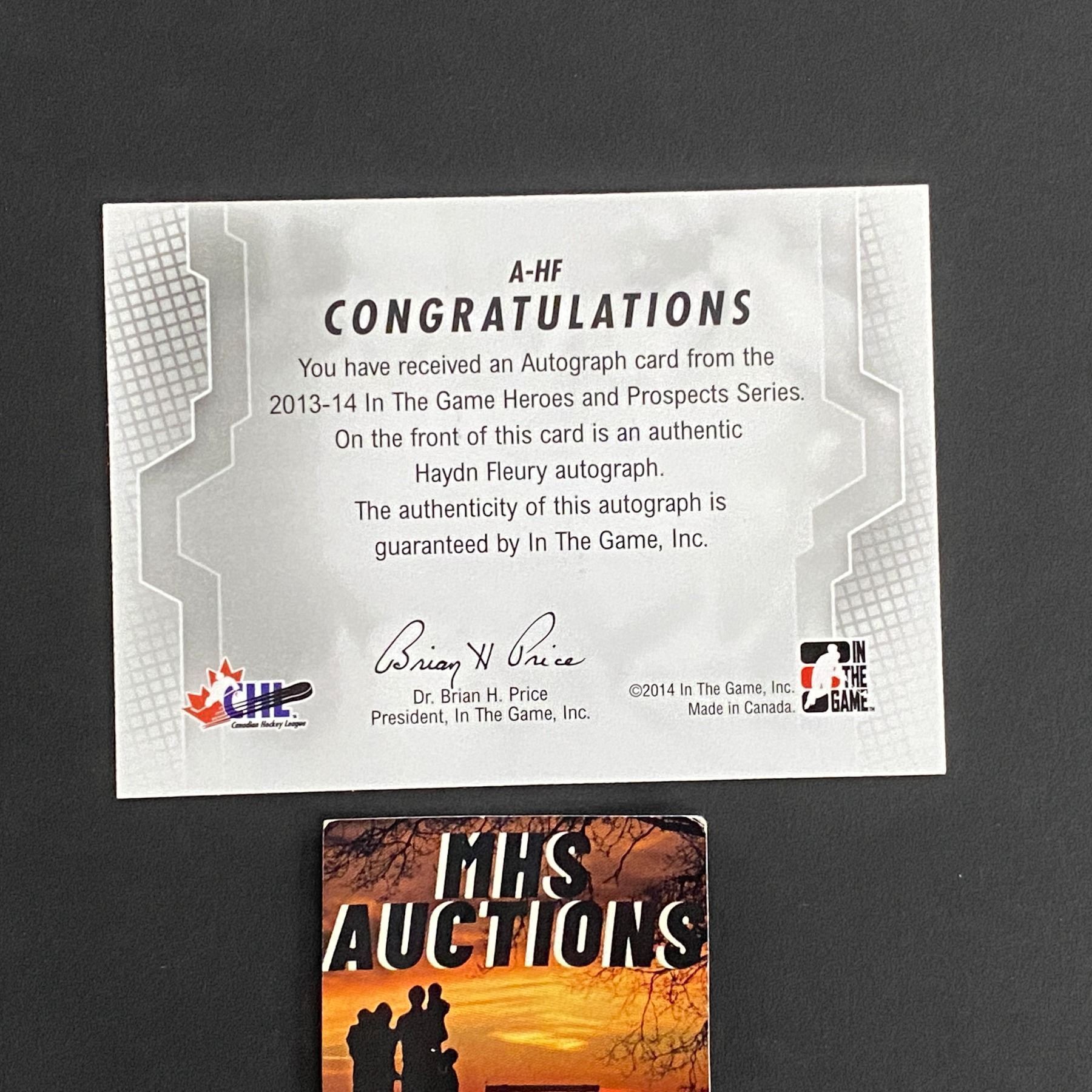 2014 IN THE GAME AUTOGRAPH HAYDN FLEURY HOCKEY CARD