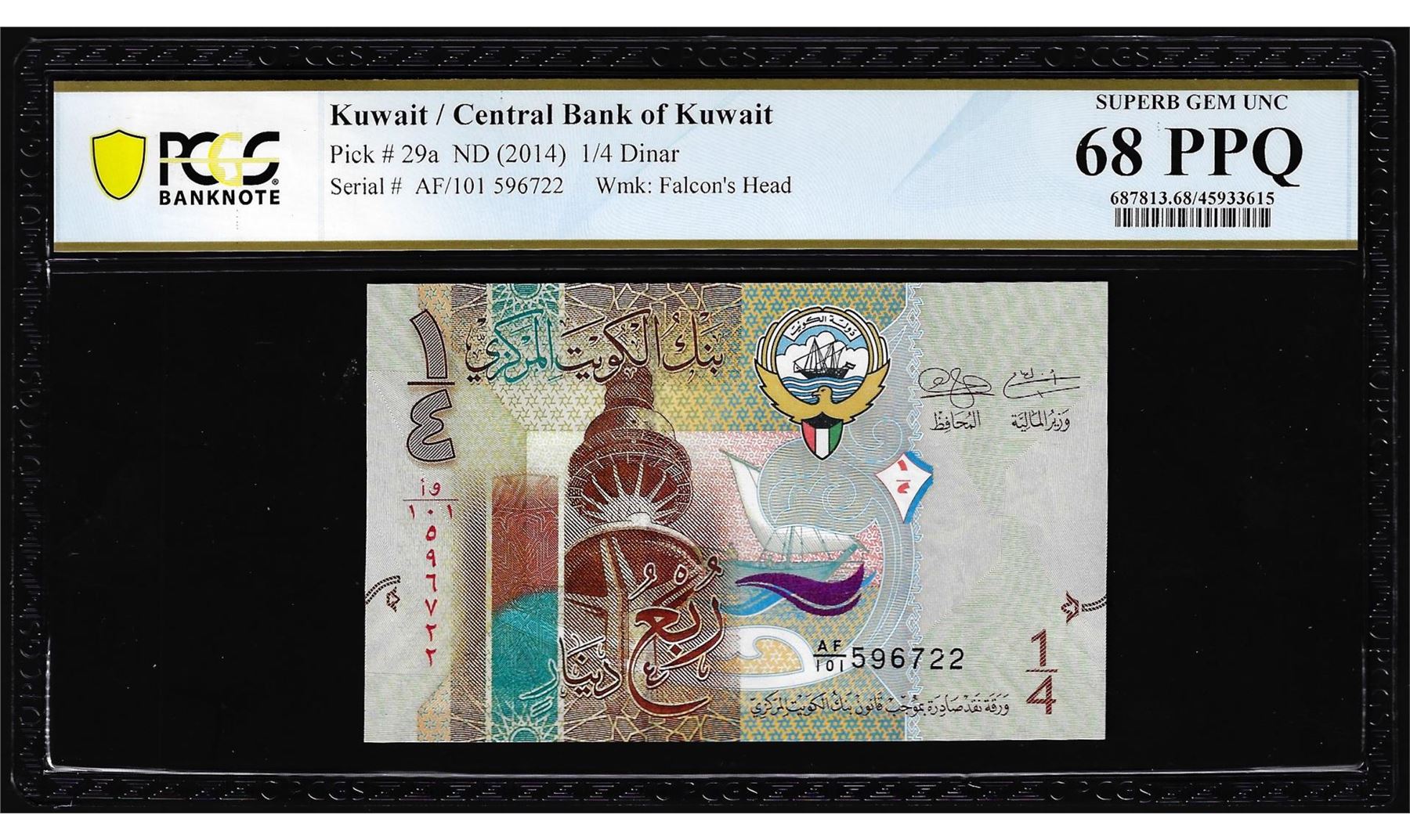 One 2014 Kuwait 1/4 Dinar Note Pick# 29a PCGS Superb Gem Uncirculated 68PPQ. PCGS Graded.