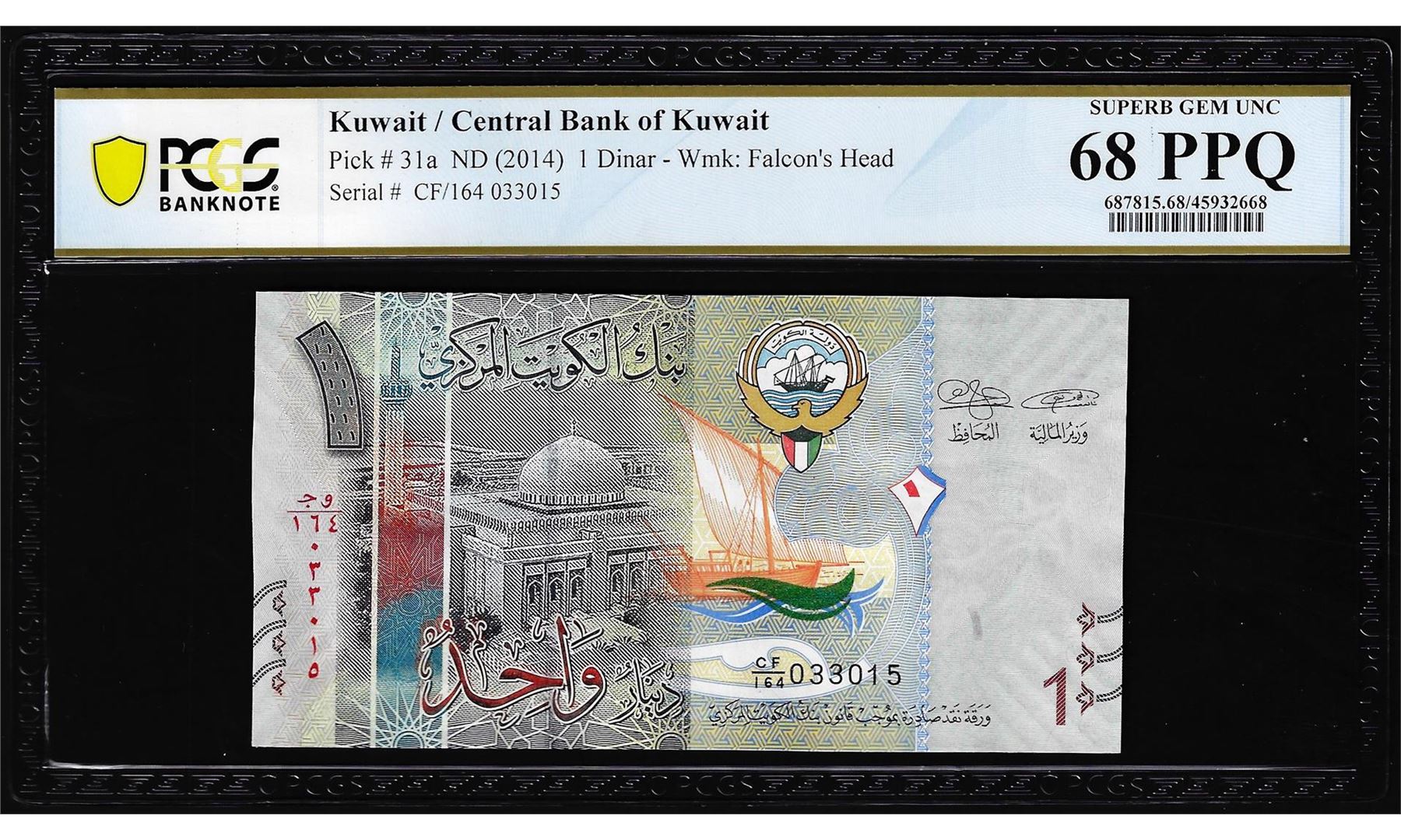 One 2014 Kuwait 1 Dinar Note Pick# 31a PCGS Superb Gem Uncirculated 68PPQ. PCGS Graded.