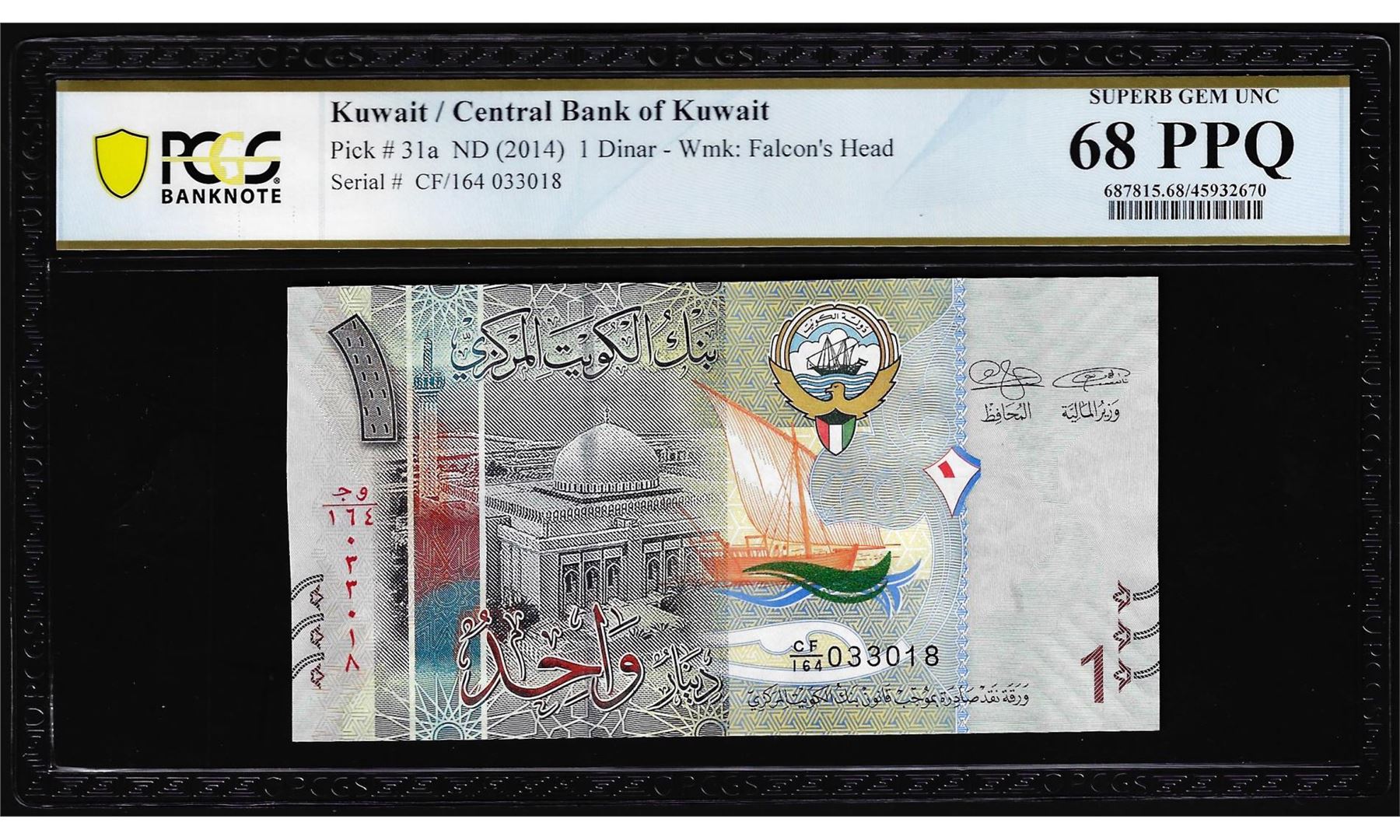 One 2014 Kuwait 1 Dinar Note Pick# 31a PCGS Superb Gem Uncirculated 68PPQ. PCGS Graded.