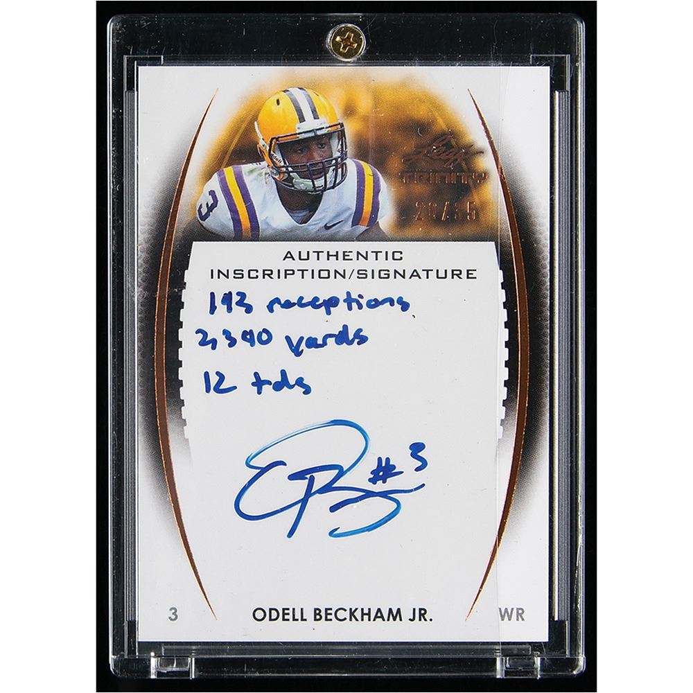 Exceptional rookie-era autographed card showing Beckham during his days at LSU, numbered 26/35, nicely signed in blue felt tip with his collegiate career statistics, "143 receptions, 2,340 yards, 12 TDs, Odell Beckham #5." Recognizing his versatility and success in his role as a wide receiver and return specialist for the LSU Tigers, Beckham was named the winner of the 2013 Paul Hornung Award. He chose to forego his senior year and enter the NFL draft, where he was picked #12 overall by the New York Giants.