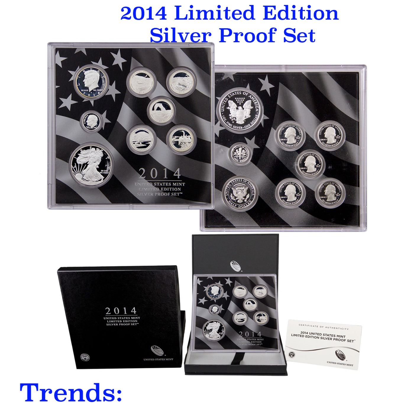 2014 Limited Edition Silver Proof Set. Limited to a production of only 50,000 sets. Set has the following Coins: 2014 W Silver Proof American Silver Eagle 2014 S Silver Proof National Park Quarters The 5 Coins are Great Smoky Mountains National Park, Tennessee, Shenandoah National Park, Virginia, Arches National Park, Utah, Great Sand Dunes National Park, Colorado, and Everglades National Park, Florida.. 2014 S Silver Proof Kennedy Half Dollar 2014 S Silver Proof Roosevelt Dime The Silver Proof American Silver Eagle Coin is the collector version of the official United States Mint American Silver Eagle Bullion Coin. This coin contains .999 fine silver and bears the W mint mark of the United States Mint at West Point. The 5 Quarters, Half Dollar, and Dime are struck in 90 percent silver, AKA coin silver and bear the S mint mark of the United States Mint at San Francisco. Countians over 1.25Oz of Pure silver