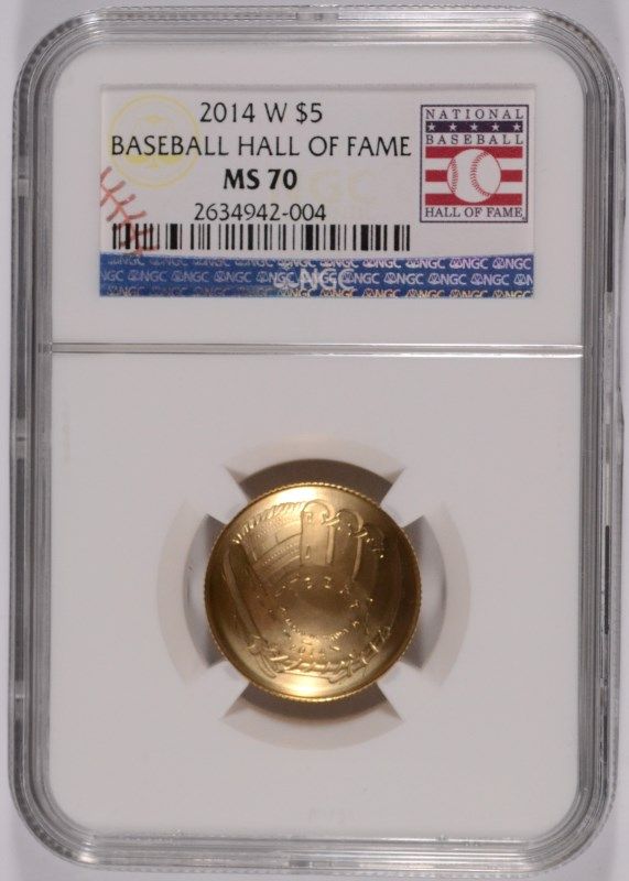 2014 NATIONAL BASEBALL HALL OF FAME  $5.00 GOLD COMMEMORATIVE, NGC GRADED MS-70!