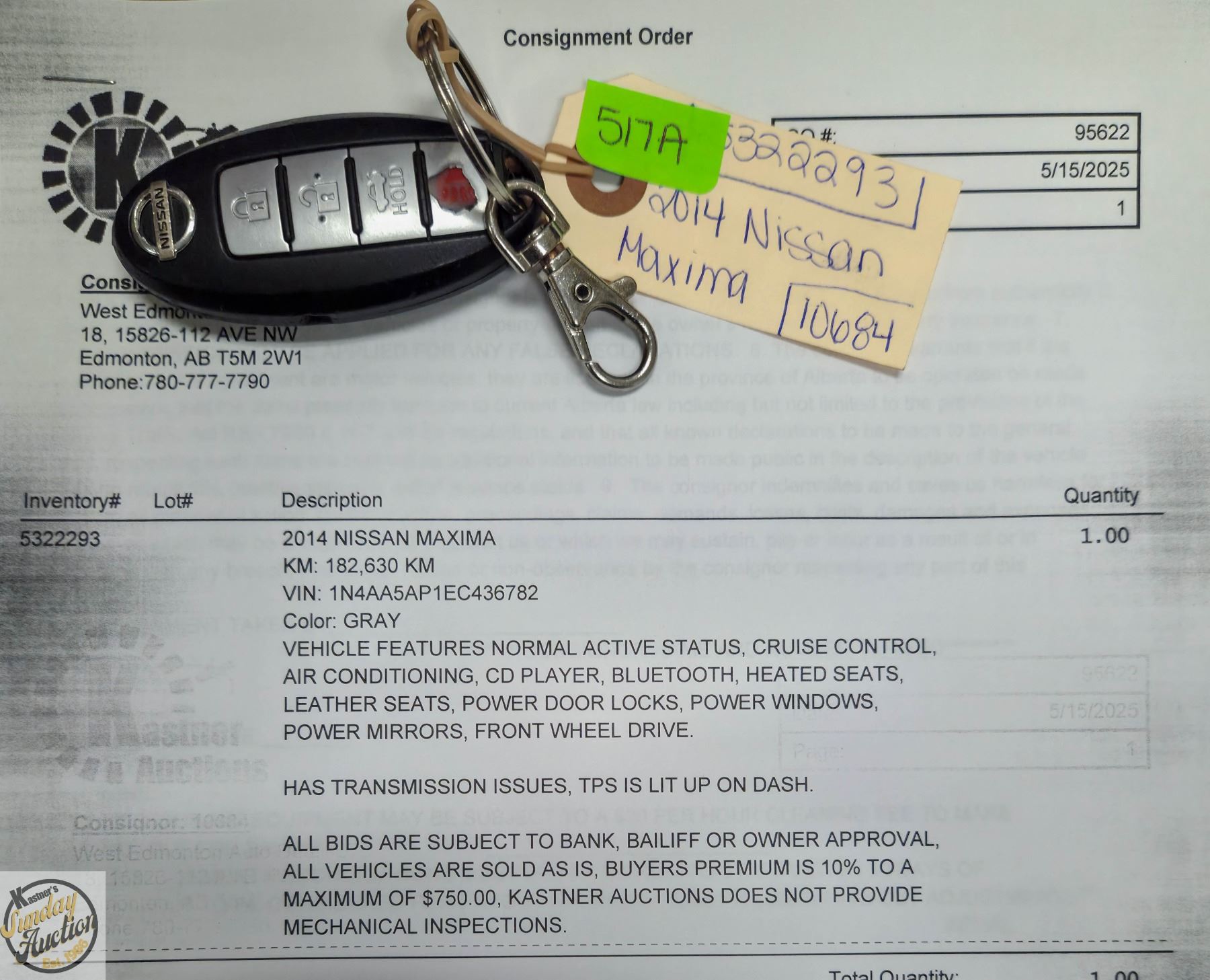 ALL BIDS ARE SUBJECT TO BANK, BAILIFF OR OWNER APPROVAL, ALL VEHICLES ARE SOLD AS IS, BUYERS PREMIUM IS 10% TO A MAXIMUM OF $750.00, KASTNER AUCTIONS DOES NOT PROVIDE MECHANICAL INSPECTIONS. **ALL ITEMS MUST BE REMOVED BY 5PM SATURDAY, MAY 24TH 2025. ALL REMAINING ITEMS WILL BE SUBJECT TO A $6.00 PER DAY STORAGE CHARGE. ANY ITEMS REMAINING AFTER MONDAY, JUNE 9TH 2025 WILL BE CONSIDERED FORFEITED. NO REFUNDS WILL BE ISSUED FOR FORFEITED ITEMS. TO SCHEDULE A PICK UP APPOINTMENT CLICK HERE