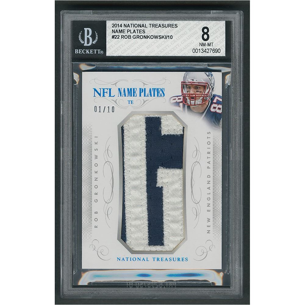 Graded by BGS NM-MT 8. Appealing game-worn relic card of talented New England Patriots tight end Rob Gronkowski, numbered 1/10, featuring the first letter "G" patch from his jersey's nameplate. A great piece from the popular player.