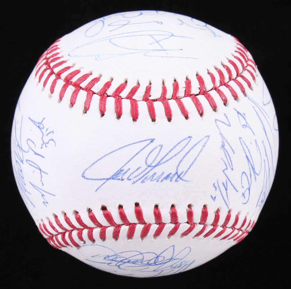 Rawlings Official Major League Baseball. Baseball has been hand-signed in blue ink pen by (22) with Derek Jeter, C.C. Sabathia, Ichiro Suzuki, Carlos Beltran, Joe Girardi, Masahiro Tanaka, Mark Teixeira, Brian Roberts, Michael Pineda, Brandon McCarthy, Matt Thornton, Shawn Kelley, Alfonso Soriano, Yangervis Solarte, Vidal Nuno (7) others. 2014 was the final season of Jeter's career.