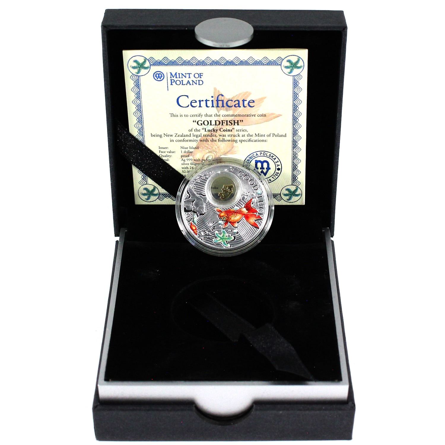 2014 Niue $1 Symbols of Luck Series - Goldfish Fine Silver Proof Coin with 24kt Gold Plated Filigree Goldfish from the Mint of Poland. Mintage of up to only 3,333! (TAX Exempt)
