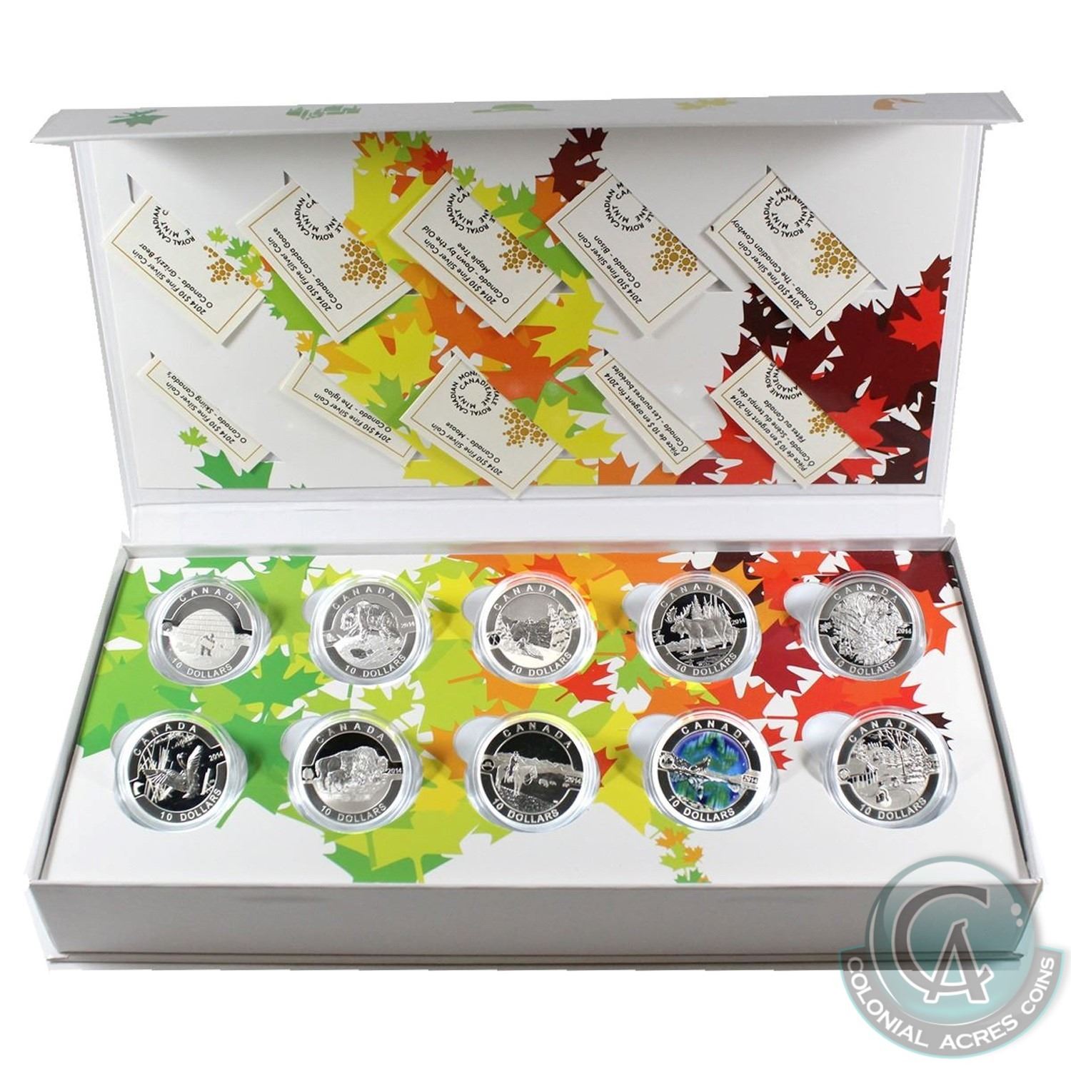 2014 O Canada $10 Complete 10-Coin Set with Deluxe Box (a few capsules may be lightly scratched). Tax Exempt