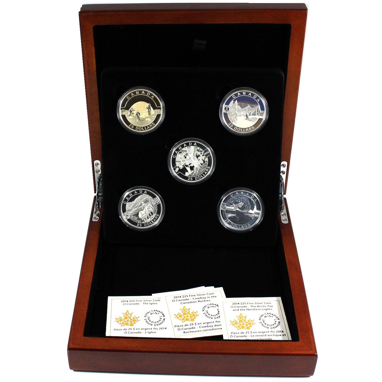 2014 O Canada $25 Complete 5-coin Fine Silver Set (Igloo coin is lightly toned & sleeve lightly bent). TAX Exempt