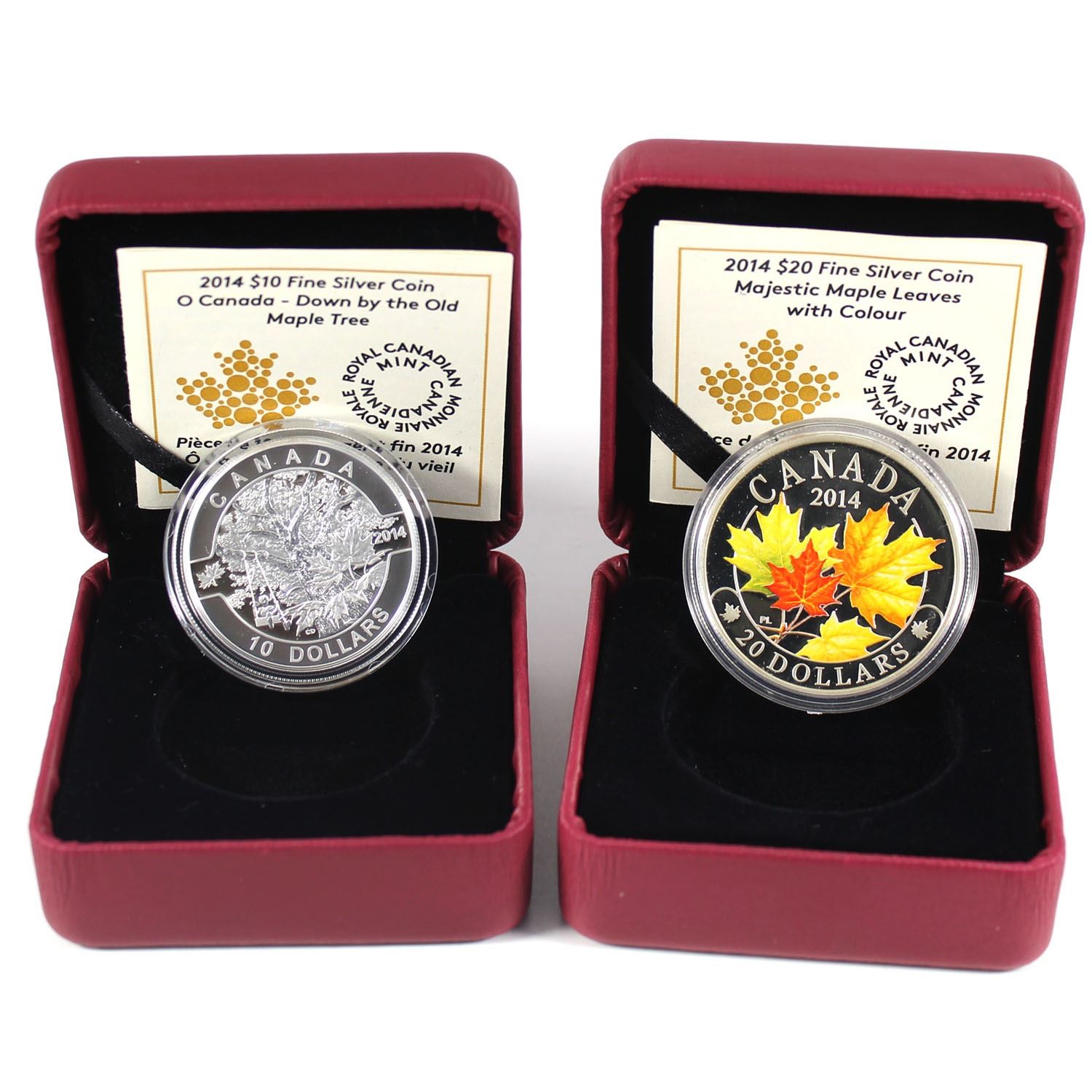 2014 O Canada Series $10 Down By the Old Maple Tree & 2014 $20 Majestic Maple Leaves with Colour (Tax Exempt). Coins come encapsulated with display box and certificate. 2pcs