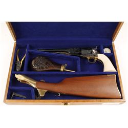 Cased engraved replica black powder single action 6-shot percussion pistol. Blued 8" barrel. Case colored loading lever and trigger. Blued cyli...