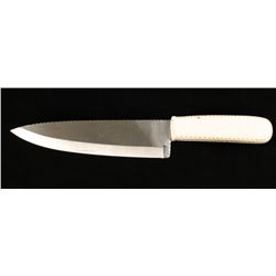 Ivory handled knife with a kitchen type blade that has a "wavy" spine. The protective cover over the blade is labeled " Ivory Handle ...