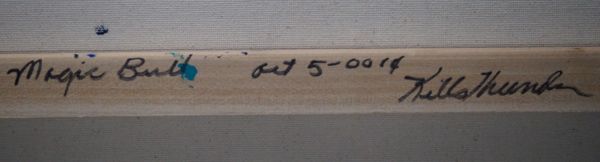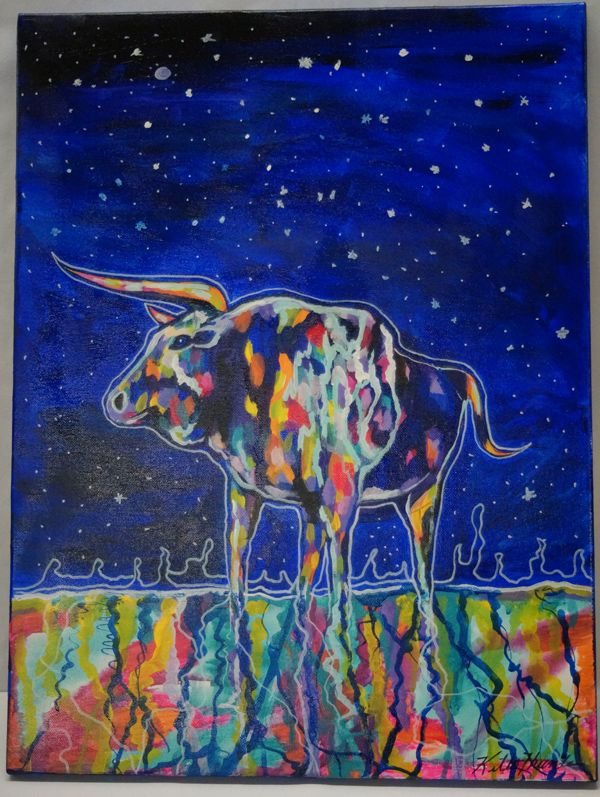 October 5, 2014 Original Acrylic Magic Bull by Kills Thunder, measures 24'' X 18'', signed in lower left by artist and also signed, dated, and titled on back of canvas, Artist Bio: Kathleen Kills Thunder was born in Seattle, Washington. Kathy has been painting and beading since she was six. She uses bright color palette and prodigious imagination in creating her painted and beaded work. Kathy currently lives in Southeast Arizona and raises buffalo when she is not pursuing her artistic endeavors.