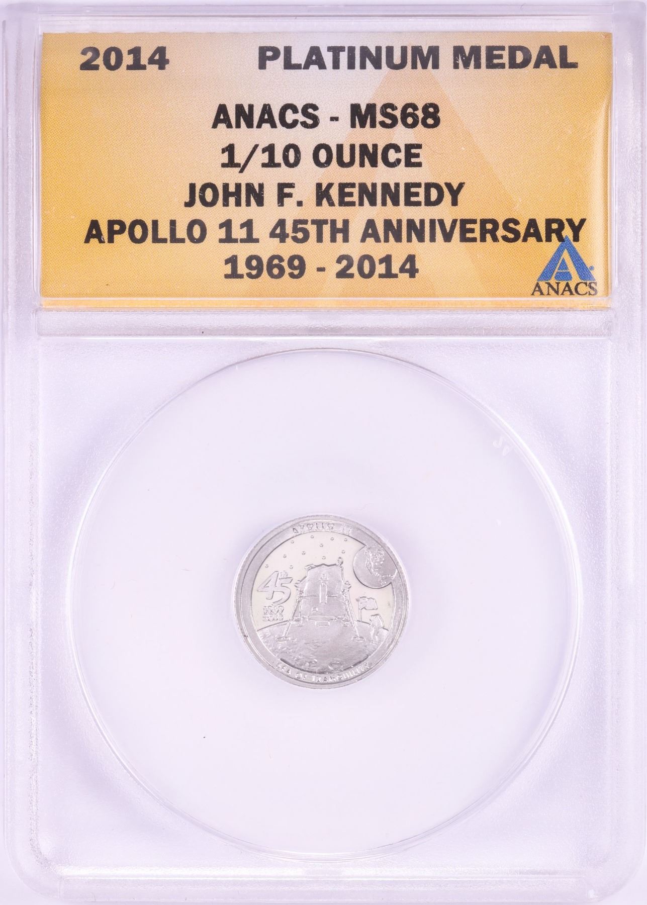 One 2014 Proof 1/10 oz Platinum JFK Apollo 11 Anniversary Medal ANACS MS68.
