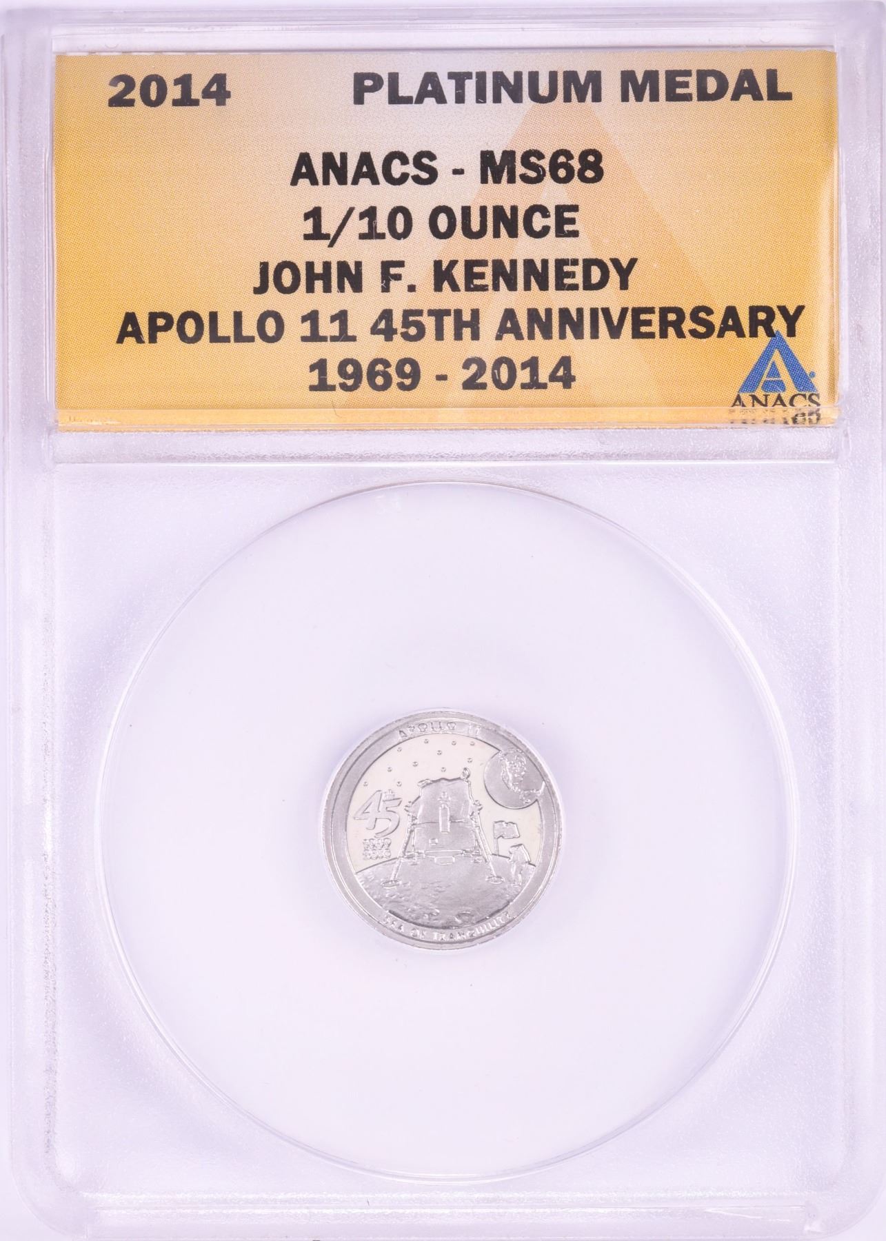 One 2014 Proof 1/10 oz Platinum JFK Apollo 11 Anniversary Medal ANACS MS68.