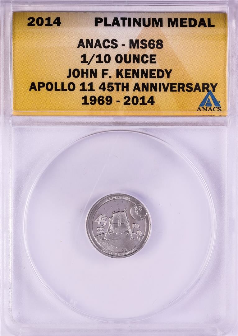 One 2014 Proof 1/10 oz Platinum JFK Apollo 11 Anniversary Medal ANACS MS68. ANACS Certified.