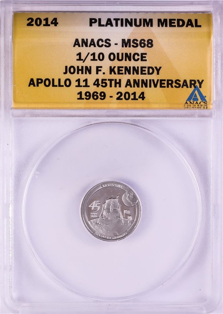 One 2014 Proof 1/10 oz Platinum JFK Apollo 11 Anniversary Medal ANACS MS68. ANACS Certified.