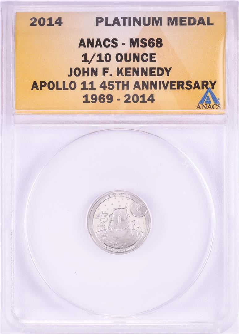 One 2014 Proof 1/10 oz Platinum JFK Apollo 11 Anniversary Medal ANACS MS68. ANACS Certified.