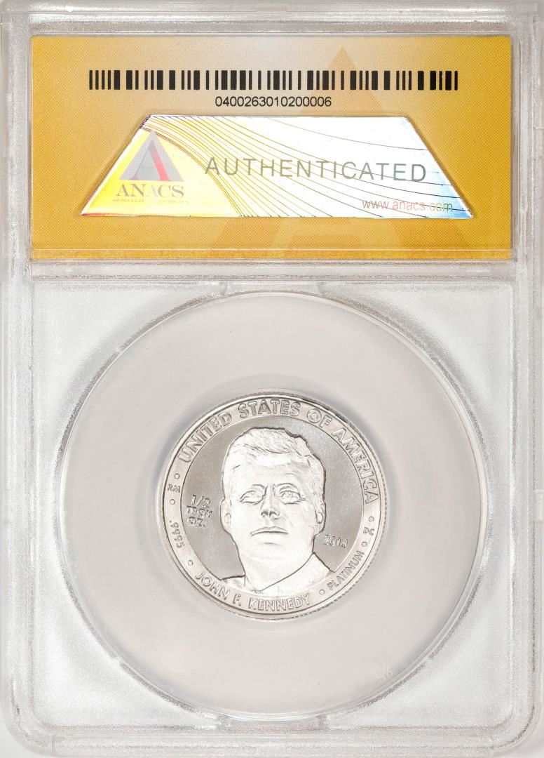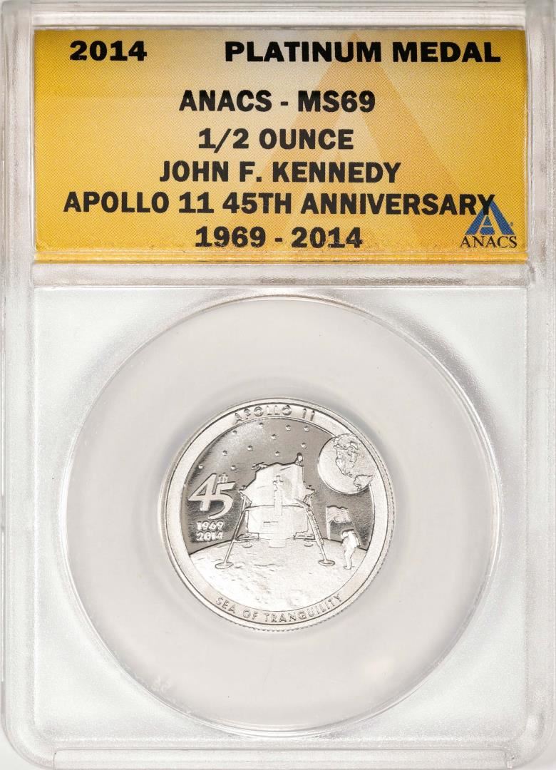 One 2014 Proof 1/2 oz Platinum JFK Apollo 11 Anniversary Medal ANACS MS69. ANACS Certified.
