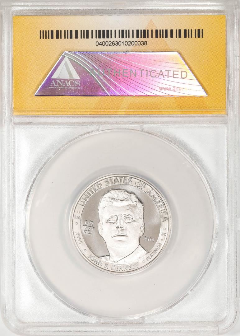 One 2014 Proof 1/2 oz Platinum JFK Apollo 11 Anniversary Medal ANACS MS69. ANACS Certified.